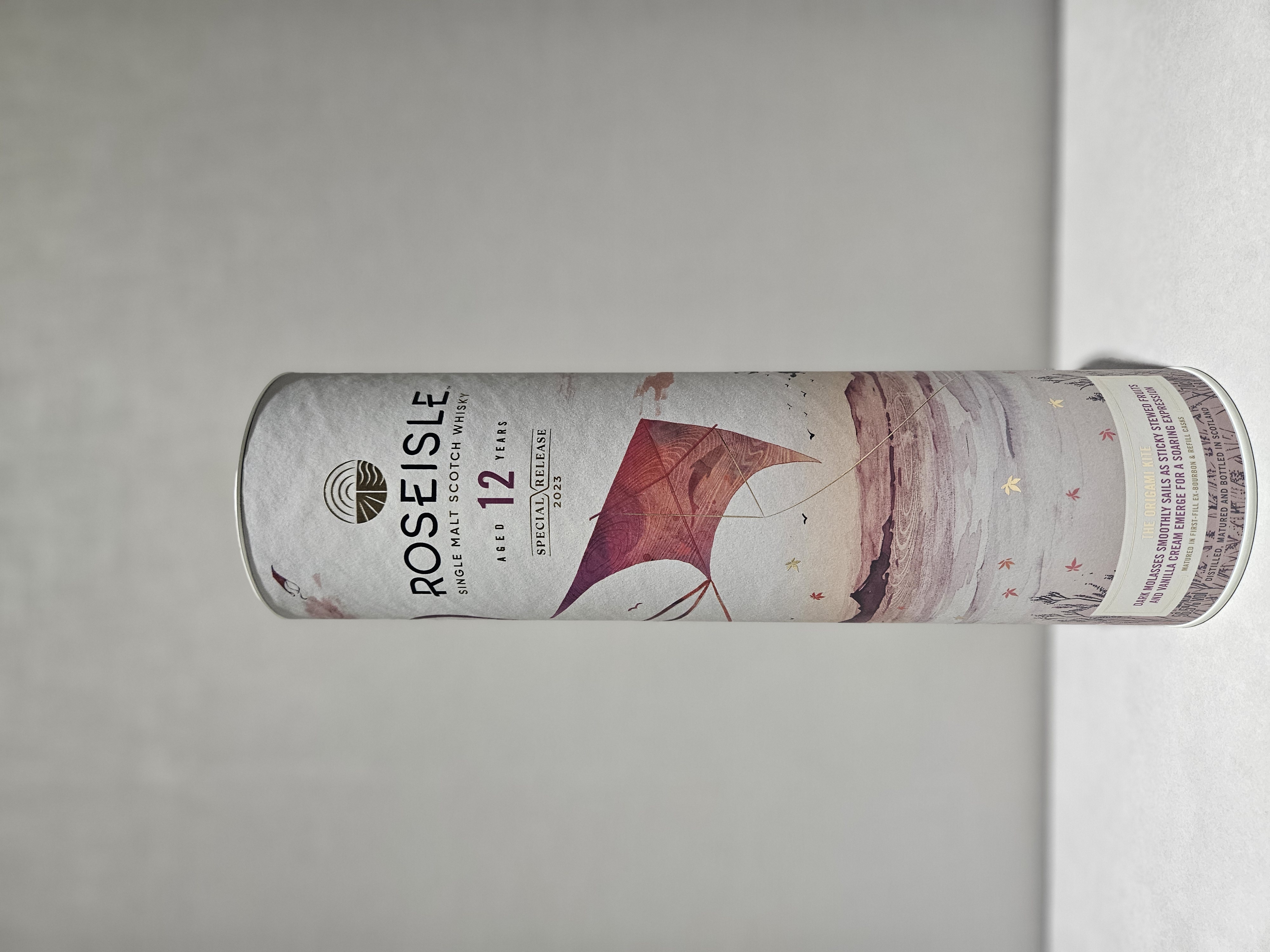 로즈아일 12년 SR 2023의 바틀과 지관통은 연을 날리는 일러스트로 꾸며져 있습니다. 처음 보는 순간부터 가볍고 산뜻한 느낌, 그리고 봄바람이 살며시 불어오는 듯한 편안한 분위기가 인상 깊었습니다. 디자인 자체가 '이 위스키는 부담 없이 즐길 수 있다'는 메시지를 전달하는 듯해, 시음 전부터 기대감이 고조되었습니다.