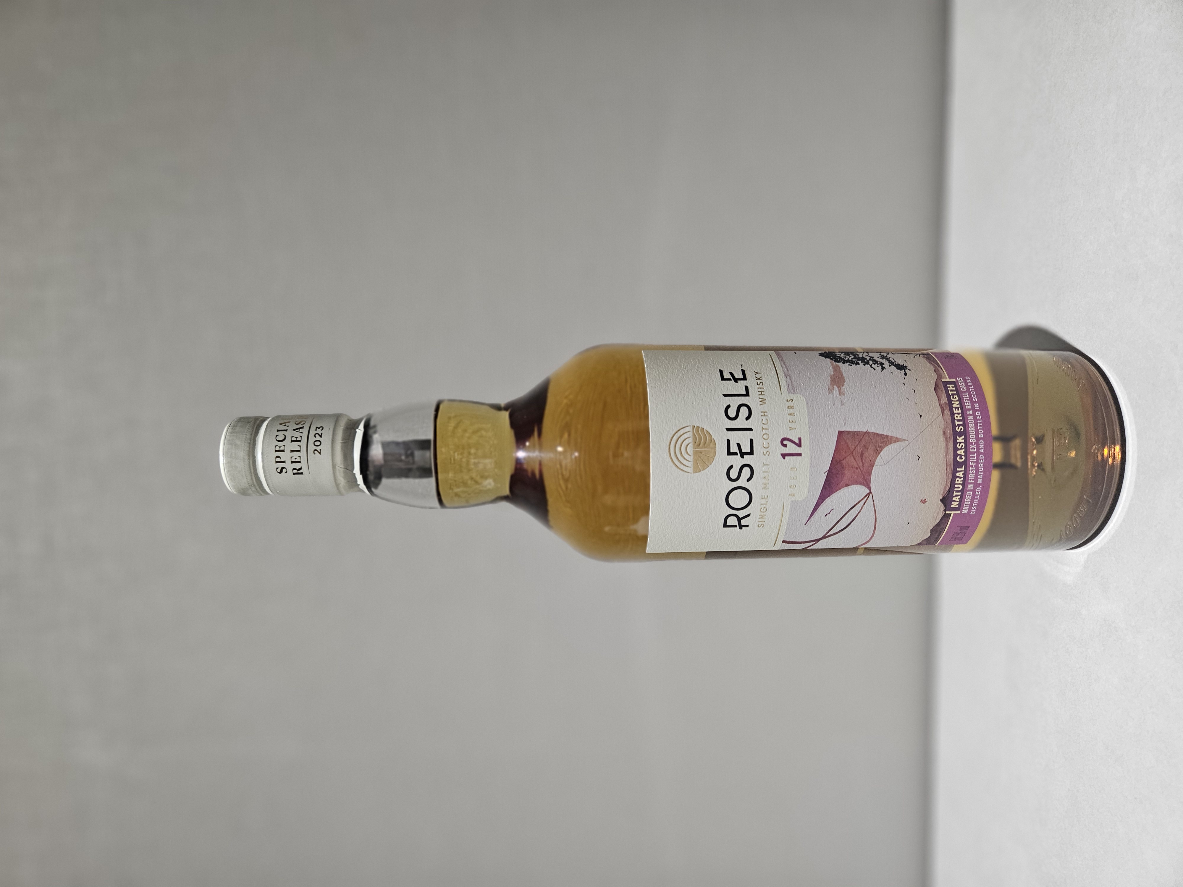 로즈아일 12년 SR 2023의 바틀과 지관통은 연을 날리는 일러스트로 꾸며져 있습니다. 처음 보는 순간부터 가볍고 산뜻한 느낌, 그리고 봄바람이 살며시 불어오는 듯한 편안한 분위기가 인상 깊었습니다. 디자인 자체가 '이 위스키는 부담 없이 즐길 수 있다'는 메시지를 전달하는 듯해, 시음 전부터 기대감이 고조되었습니다.