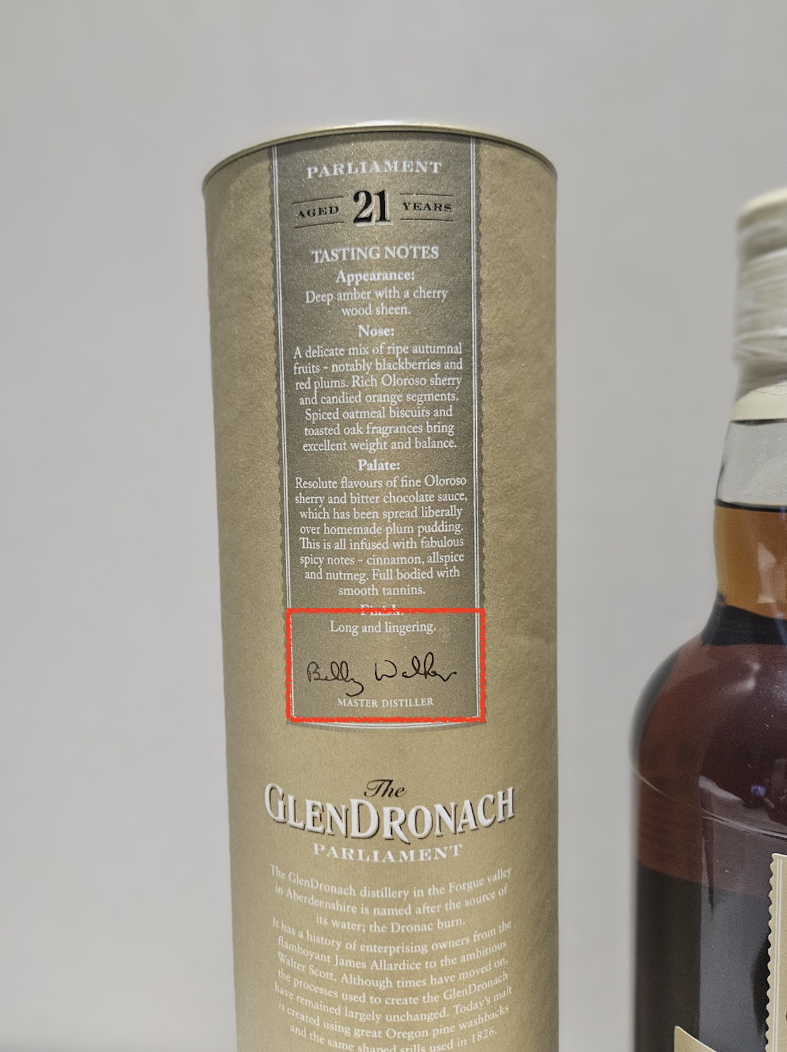 더욱 직관적인 방법도 있습니다. 지관통 뒷면을 확인해 보면 ‘MASTER DISTILLER’라는 문구 아래에 실제 마스터 디스틸러의 사인이 표기되어 있습니다. 여기서 ‘BILLY WALKER’라고 적혀 있다면 빌리워커 버전, ‘RACHEL BARRIE’라고 적혀 있다면 레이첼 베리 버전임을 한눈에 알 수 있습니다.