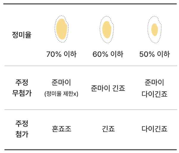 사케는 정미율에 따라서 아래와 같이 등급이 나눠진다
