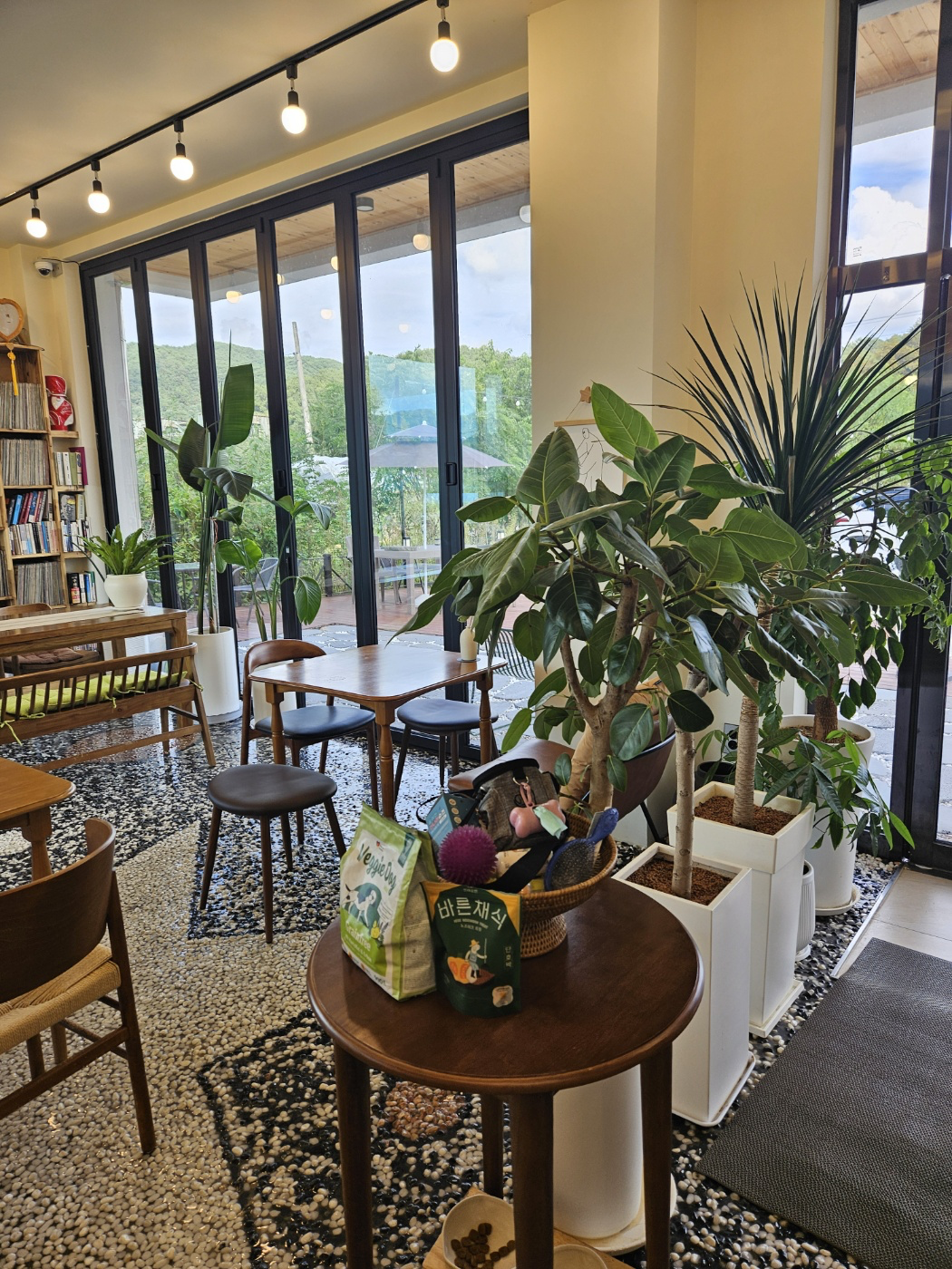 카페 방문하여 제가 앉았던 창가쪽 공간의 모습입니다. 밖에 보이는 부분이 주차장이라 만약 차가 많다면 자동차들만 보이겠지만 그래도 탁트여있는 듯한 모습에 여유있게 머무르기 좋은 분위기 였습니다. 사장님이 정말 식물을 좋아하셔서 그런지 카페에는 메인공간처럼 계속 보이는게 크고 작은 식물들이였습니다.