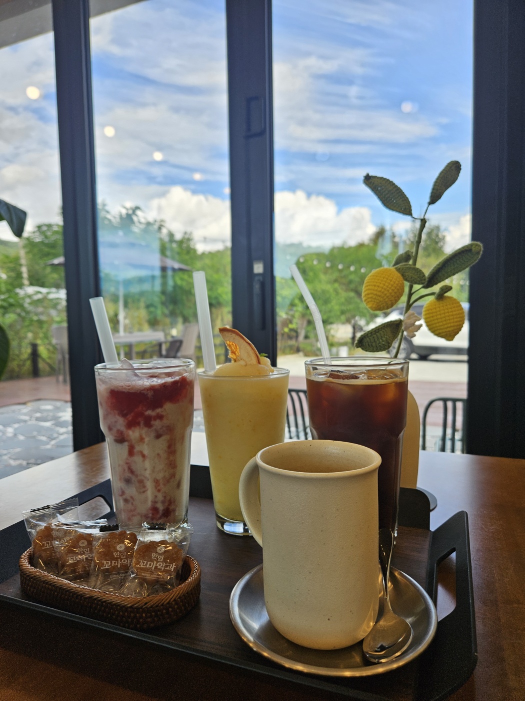 방문하여 마신 음료수는 아이스 아메리카노와 딸기라떼, 유자블렌디드, 쌍화차를 주문했습니다. 사장님이 센스 있으시게 인원 수에 맞게 꼬마 약과를 서비스로 주셨습니다. 덕분에 커피와 곁들어서 맛있게 먹었습니다. 카페 내부에서 중간 중간 다른 나라의 과자를 판매하고 계시는 듯한 모습도 보였습니다.