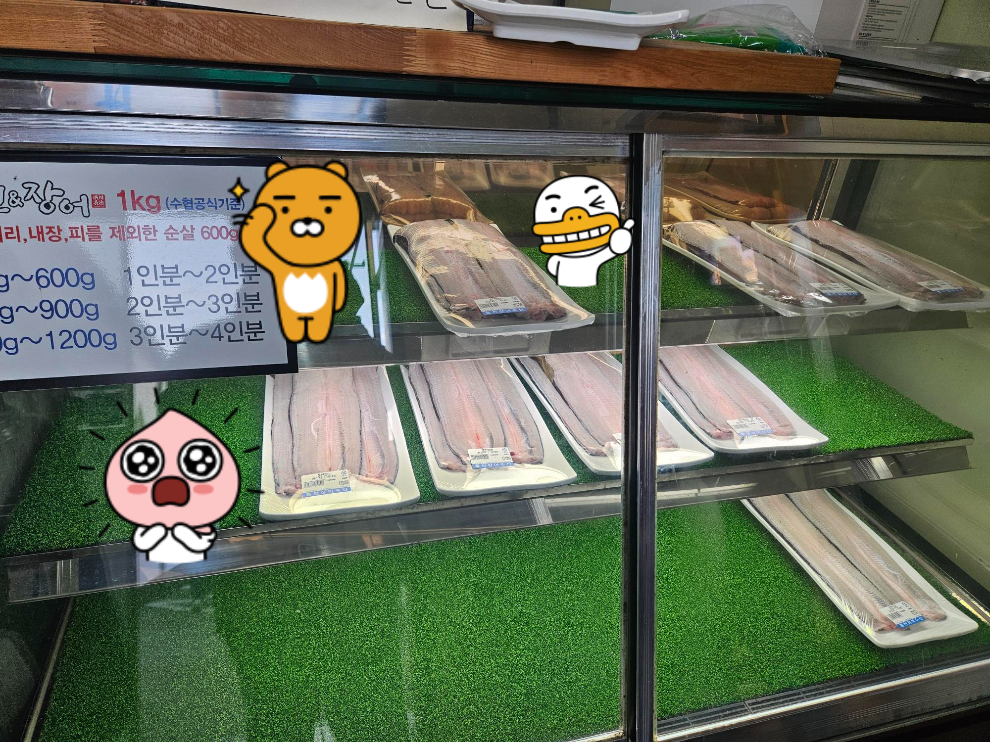 메뉴판에서 나와있는것처럼 홍천&장어에서는 "장어는 판매장에서 구입해주세요"라는 문구를 볼 수있습니다. 장어를 바로 주문하는것이 아니라 가게 오른쪽 뒷편 장어판매장에서 장어를 골라서 계산 후 자리에서 구워 먹는 시스템입니다. 장어는 따로 계산을 하고 자리에 대한 상차림비를 인원기준으로 받고 있습니다. 상차림비와 다른 추가 메뉴에 대한 금액은 모두 드신 후 나갈 때 계산을 별도로 하면 됩니다.