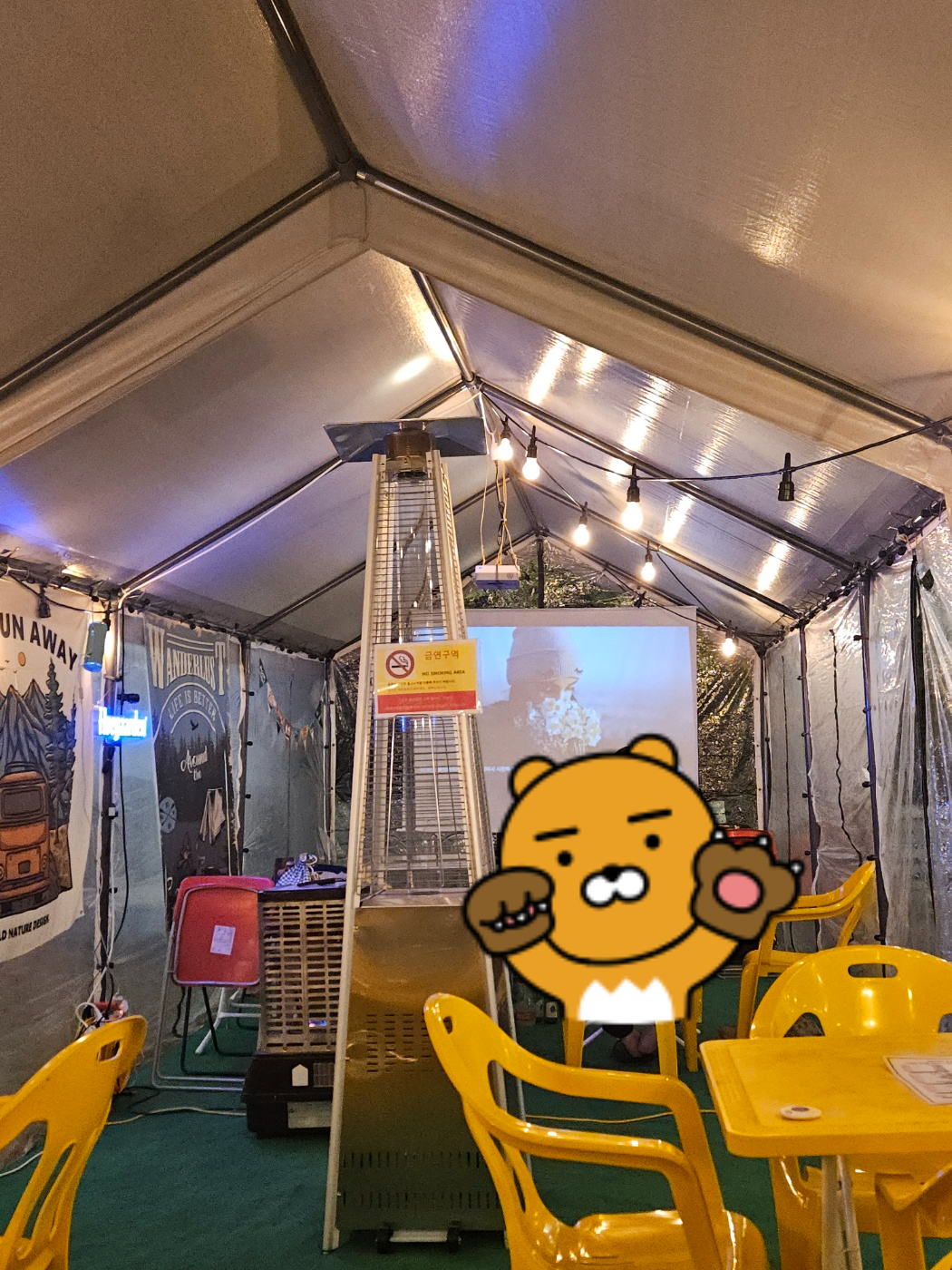 이번에 가서 먹고 왔던 야외에 세팅되어 있는 하우스(?)의 모습입니다. 밖은 바람이 불고 추웠지만 안에서는 따뜻하게 난로도 피워주고 훈훈한 분위기가 연출되어 있어서 추위를 많이 느끼진 못했습니다. 개인적으로는 입고 갔던 외투를 벗고 식사를 했습니다. 물론 술을 마신 것도 있어서 참고해 주시면 감사하겠습니다.