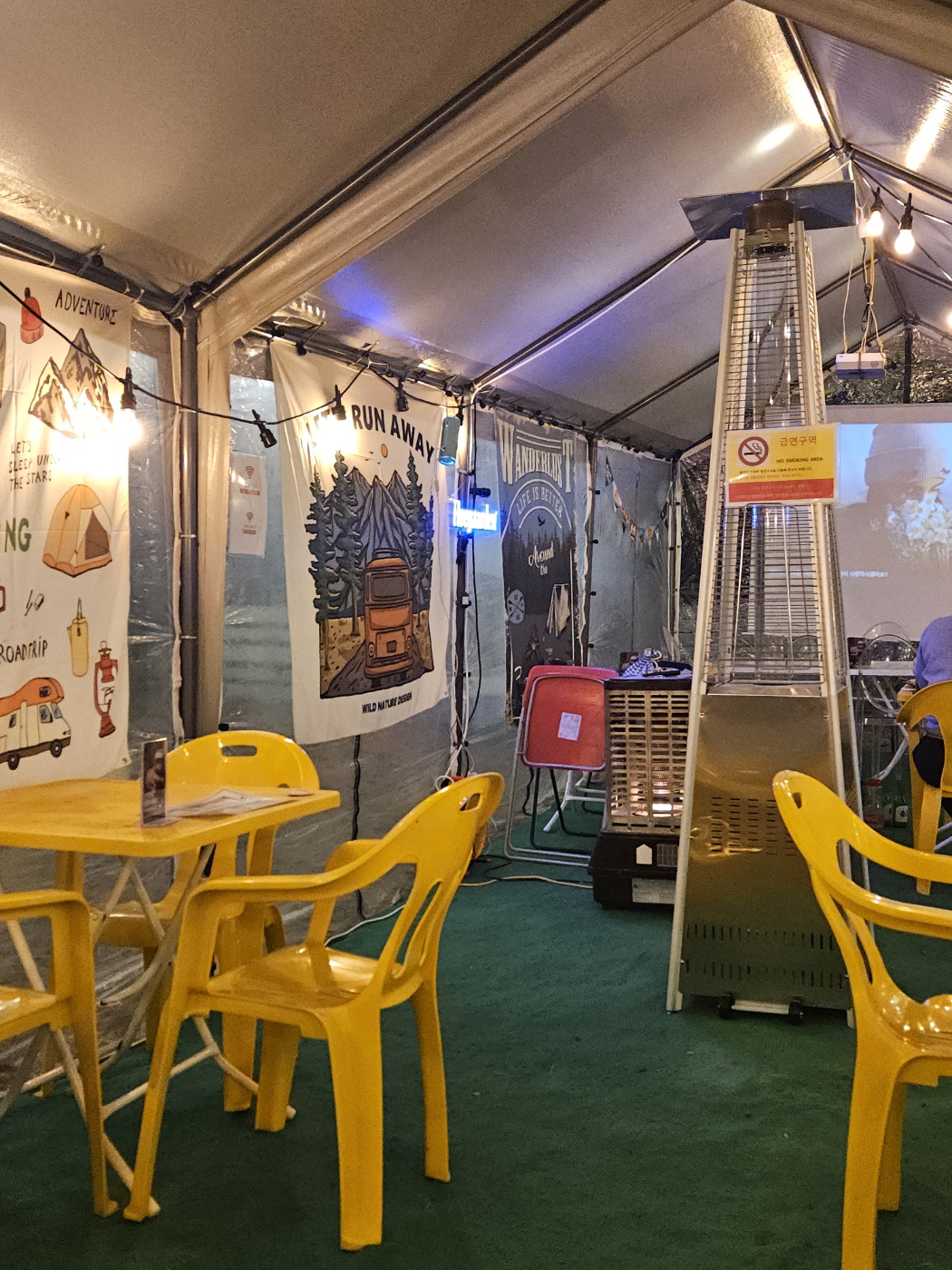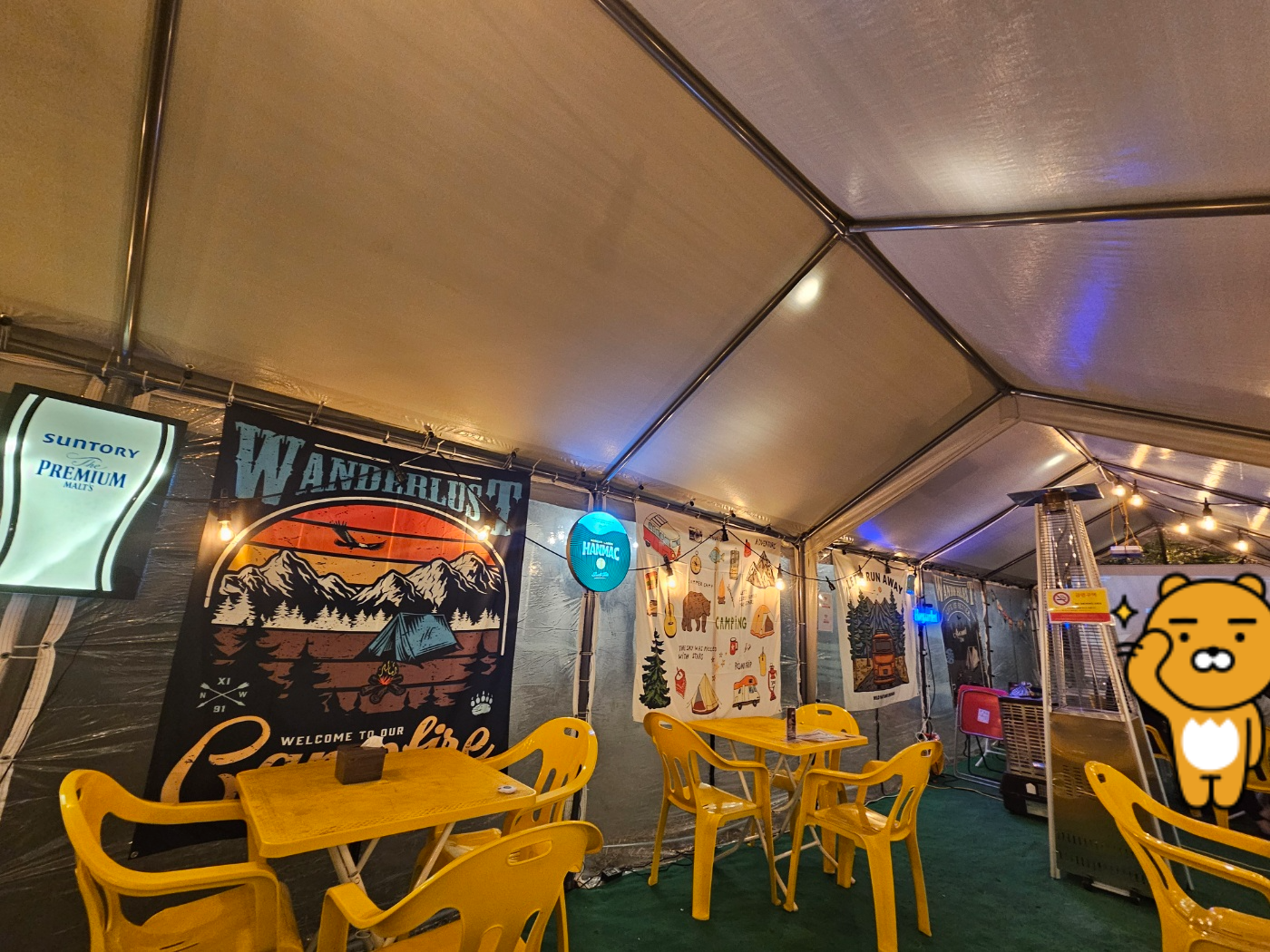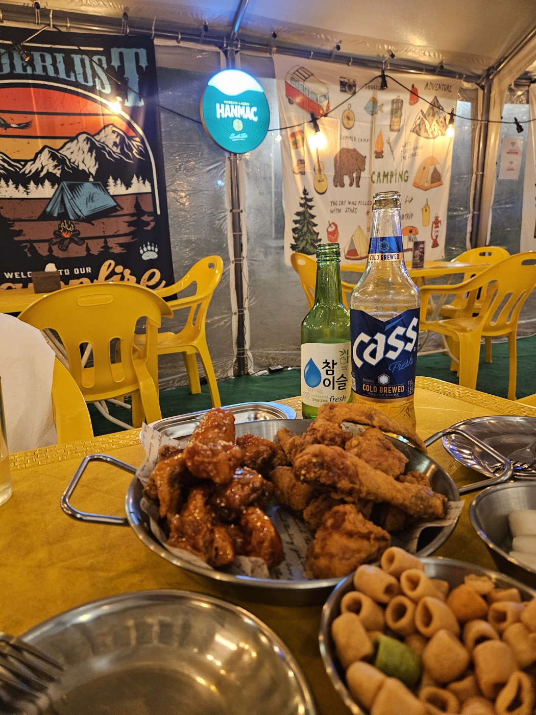 야외에 세팅되어 있는 하우스 안에는 사장님의 인테리어 센스를 볼 수 있었습니다. 자메이카 분위기인 것 같기도 하고 약간 아이의 방을 캠핑 하우스처럼 꾸민듯한 느낌도 들었습니다. 음식이 나오기 전까지 계속 캠핑에 온 거 같은 분위기를 만끽하며 메인 안주가 나오지도 않았는데 이미 분위기에 들떠 있었던 것 같습니다.