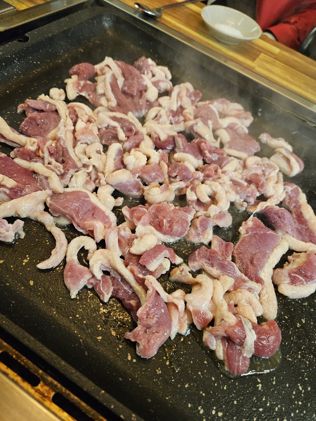 오리주물럭, 오리로스, 오리훈제 등 기본 메뉴들은 3 ~ 4인분을 기준으로 구성이 되어있다고 하셨습니다. 저희 테이블 3명은 오리로스 한마리(800g)짜리를 주문하여 먹었고 옆테이블 3명은 오리주물럭 한마리(800g)를 먹었습니다.