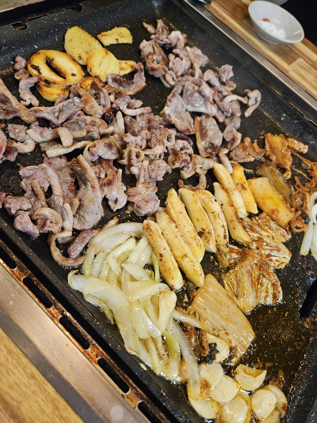 오리로스구이에는 오리 기름을 이용하여 구워 먹으면 맛있는 감자, 양파, 떡, 묵은지를 별도로 제공해줍니다. 이반찬을 별도로 제공해 줌으로 로스오리구이의 매력을 배로 즐길 수 있었습니다.