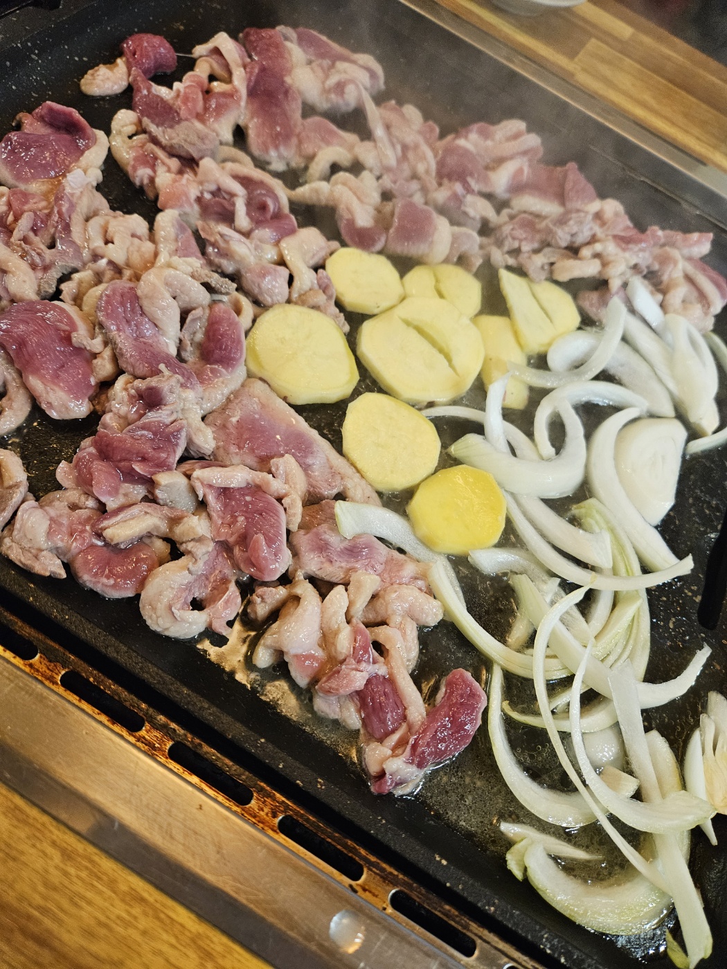 오리주물럭은 로스구이와는 달리 감자와 떡 그리고 양파가 양념과 함께 버무려져서 나옵니다. 결국 로스구이와의 차이는 같이 섞여 나오는지 따로따로 나오는지의 차이입니다.