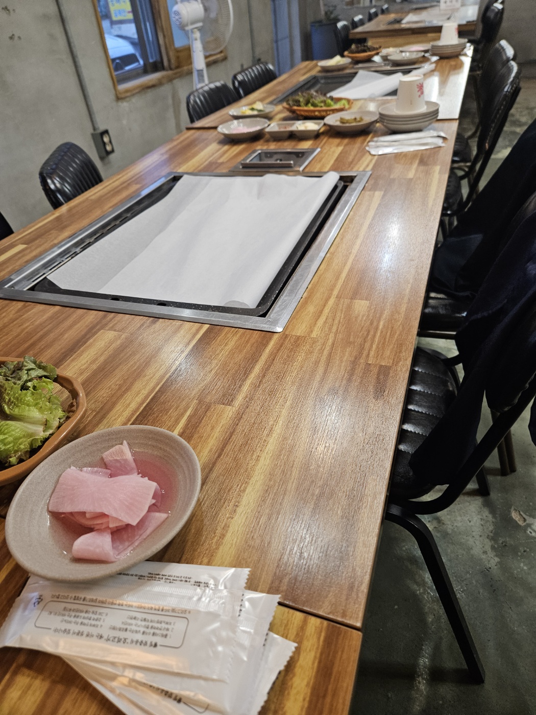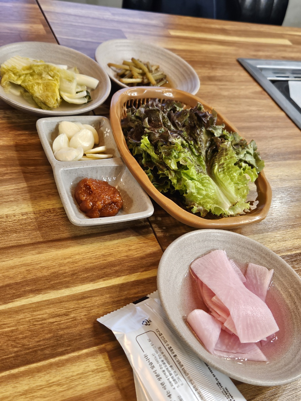 기본 반찬은 주로 쌈을 싸먹을 수 있는 구성 위주로 세팅이 되어 나옵니다. 여기서 나온 마늘쫑이 정말 맛있어서 리필을 여러번해서 먹었습니다.