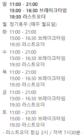 - 영업시간 : 매주 월요일 휴무 / 그 외 영업시간은 아래 표 참조