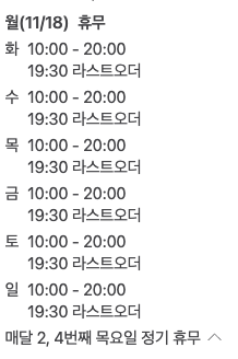 • 영업시간 : 매주 월요일 휴무 / 그 외 영업시간은 아래 표 참조