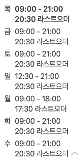 - 영업시간 : 매주 일요일만 12:30 분 오픈 / 그 외 영업시간은 아래 표 참조