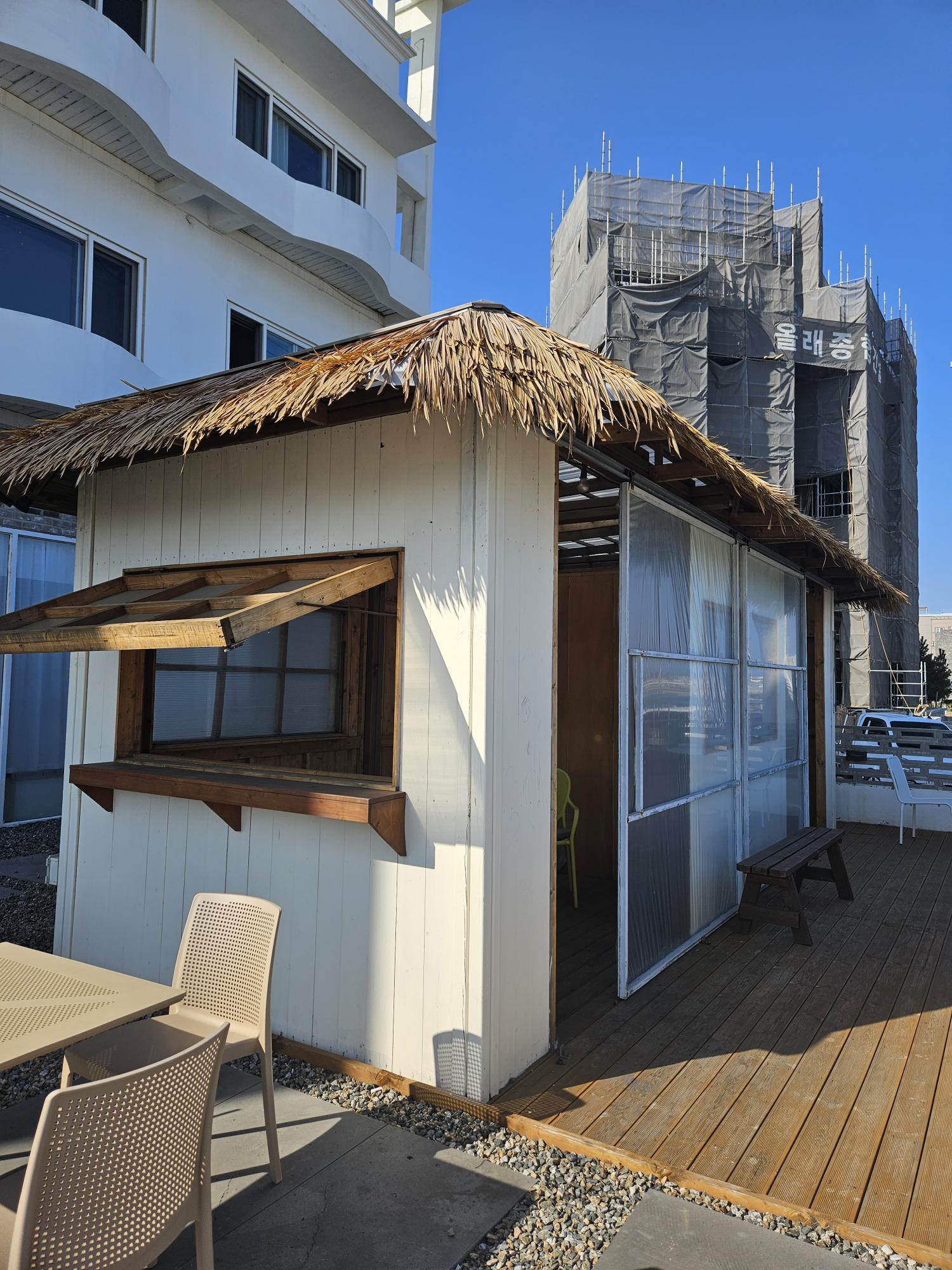 메인 건물 바로 앞에 하와이를 연상시키는 감성적인 작은 공간이 있어 들어가 보았습니다. 그런데 그 공간은 카페용이 아닌, 고기를 구워 먹기 위한 세팅이 되어 있었습니다. 이로 미루어 보아, 이곳은 펜션을 별도로 운영하고 있는 것이 확실해 보였습니다.