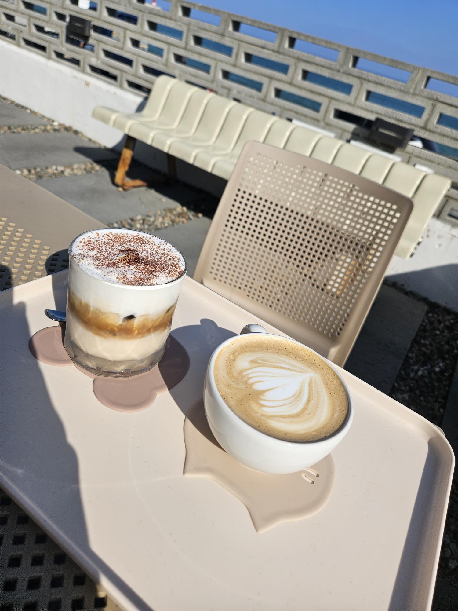 카페 웨이브지의 대표 메뉴인 웨이브지 라떼와 따뜻한 바닐라 라떼가 나왔습니다. 바닷바람을 맞으며 따뜻한 커피를 마시는 것도 좋았지만, 웨이브지 라떼 특유의 고소함과 달콤함이 정말 맛있었습니다.