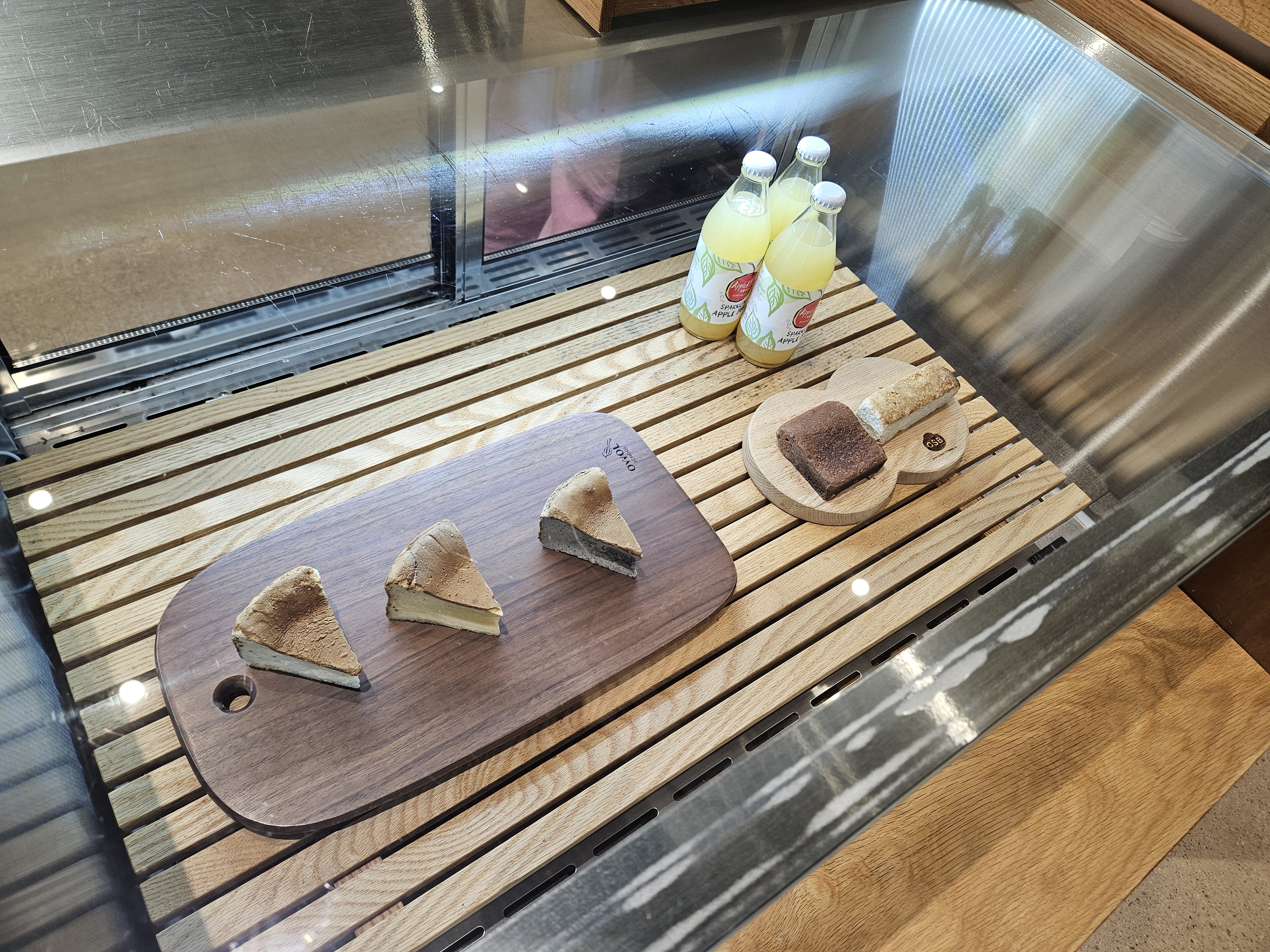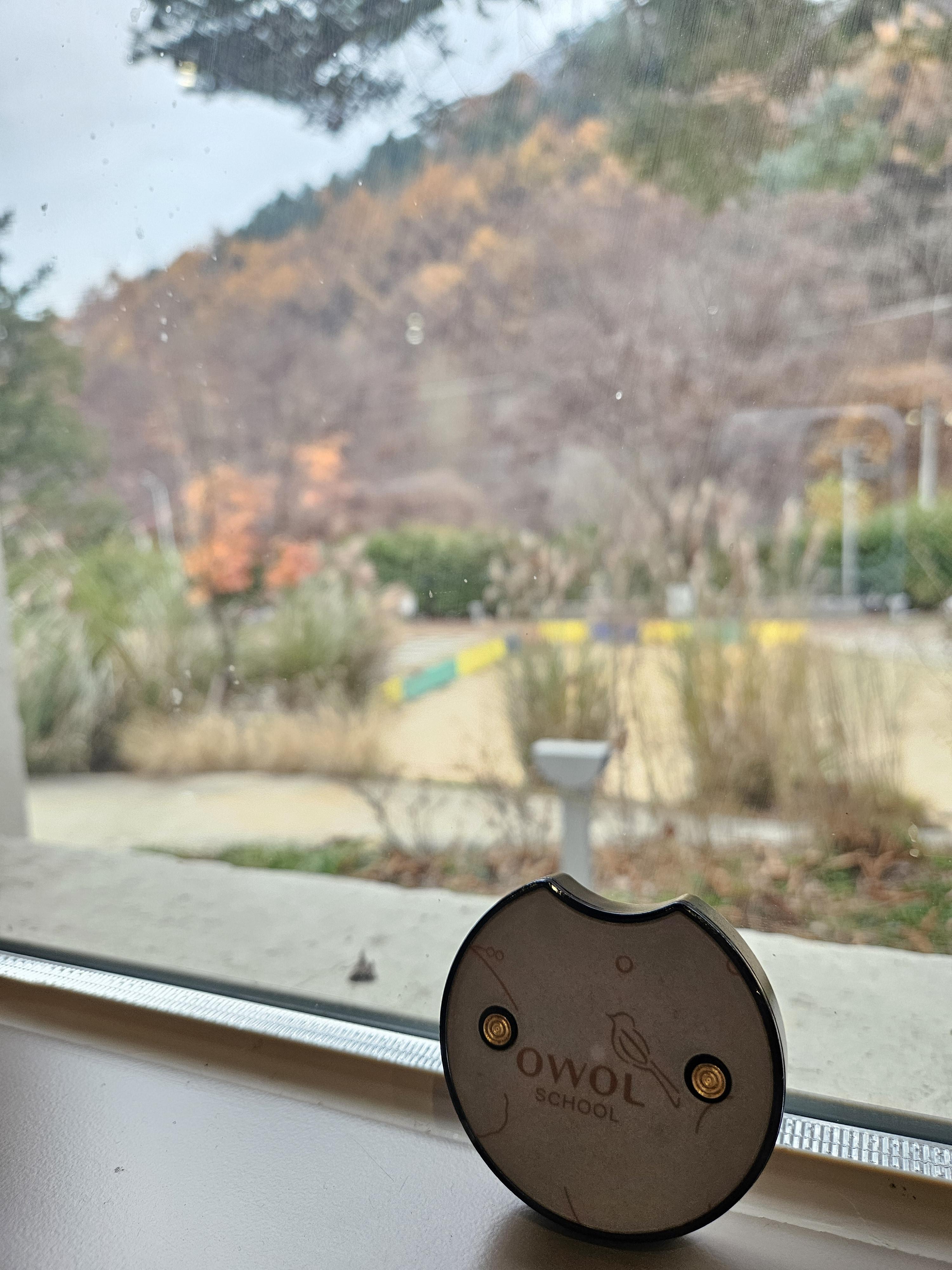 춘천 카페 오월학교에서는 사진에 보이는 것처럼 간단한 쿠키와 조각 케이크도 판매하고 있습니다. 배가 많이 부르지 않았다면 쿠키나 케이크를 먹어봤을 텐데, 먹어보지 못한 아쉬움이 남았습니다. 또한, 오월학교만의 로고인 참새가 그려진 진동벨이 너무 귀여워서 한 컷 찍었습니다. 창가에서 구경하는 새를 표현한 듯한 모습이 인상 깊어서 찍어보았습니다.