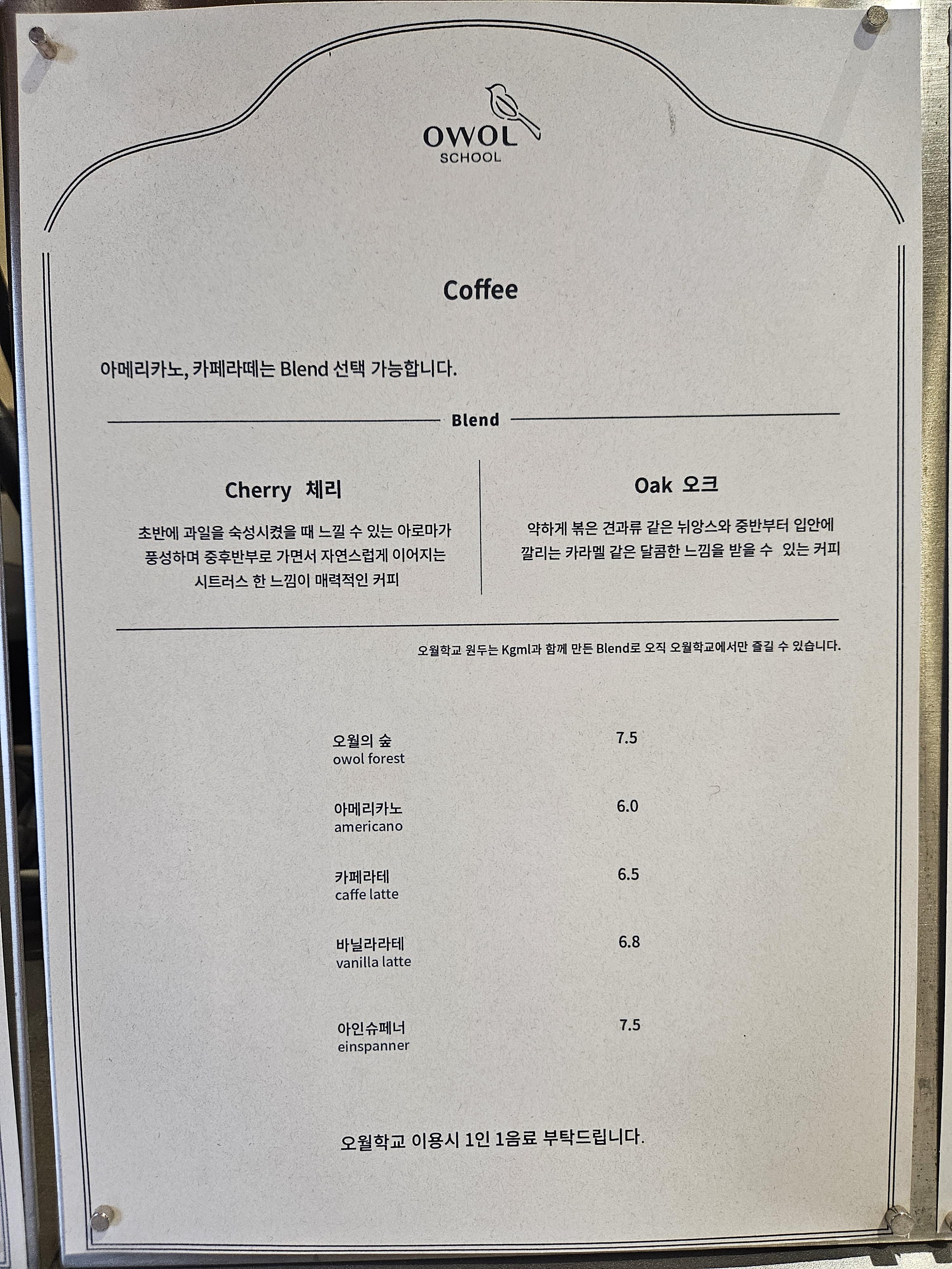 개인적으로는, 가볍고 약간의 산미 혹은 상큼한 느낌의 커피를 좋아하신다면 '체리' 원두를, 조금 더 무겁고 바디감이 있으며 달콤한 커피를 원하신다면 '오크' 원두를 추천드립니다. 아이스 아메리카노도 고르는 재미가 있고 독특해서 맛있었지만, 오월학교의 시그니처 메뉴인 참새라떼는 정말 매력적인 음료였습니다. 달콤하면서도 상큼한 느낌이 조화를 이루어, 기분 좋게 상쾌한 라떼를 마시는 듯한 맛을 느낄 수 있었습니다.