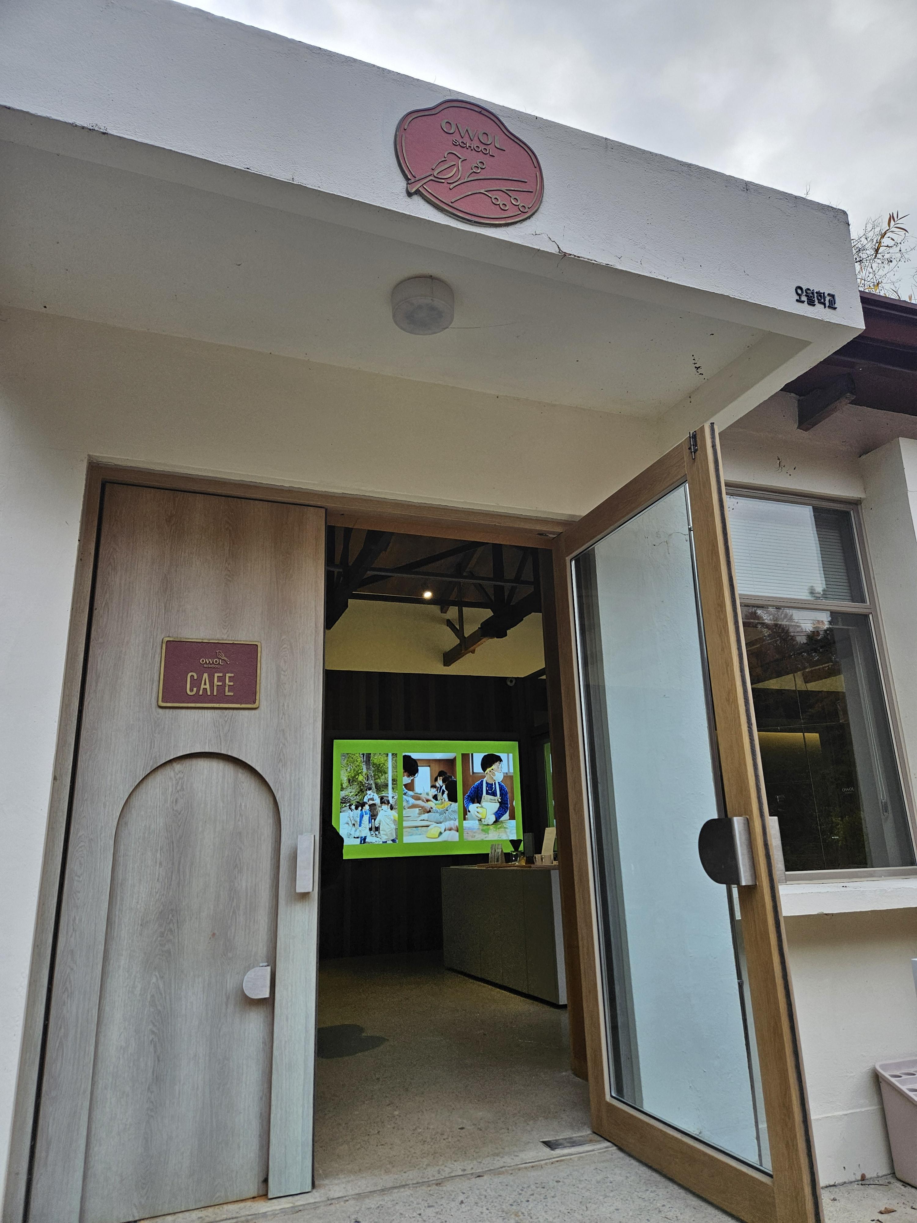 고즈넉한 분위기가 매력적인 춘천 카페 오월학교의 입구 모습입니다. 사진을 보고 있노라면 당시 느꼈던 조용하고 평화로운 분위기가 다시 떠오르는 듯합니다. 조용하고 고즈넉한 분위기와는 반대로, 오월학교의 로고와 간판은 세련된 감각을 더해주어 상반된 매력이 돋보였습니다. 이러한 조화가 이곳만의 독특한 매력을 한층 더 깊이 느끼게 해 줍니다.