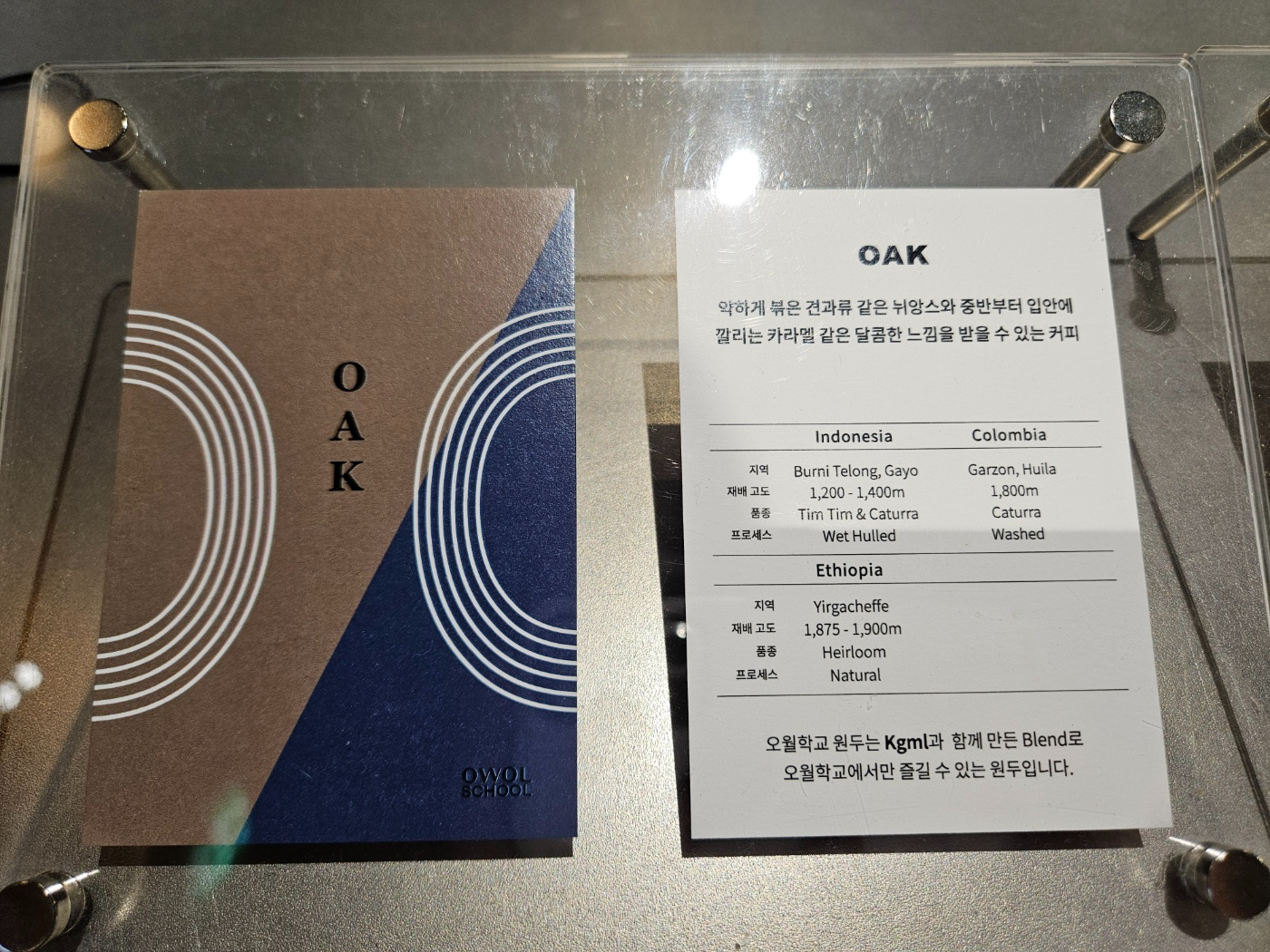 오크 : 약하게 볶은 견과류 같은 뉘앙스와 중반부터 입안에 깔리는 카라멜 같은 달콤한 느낌을 받을 수 있는 커피
