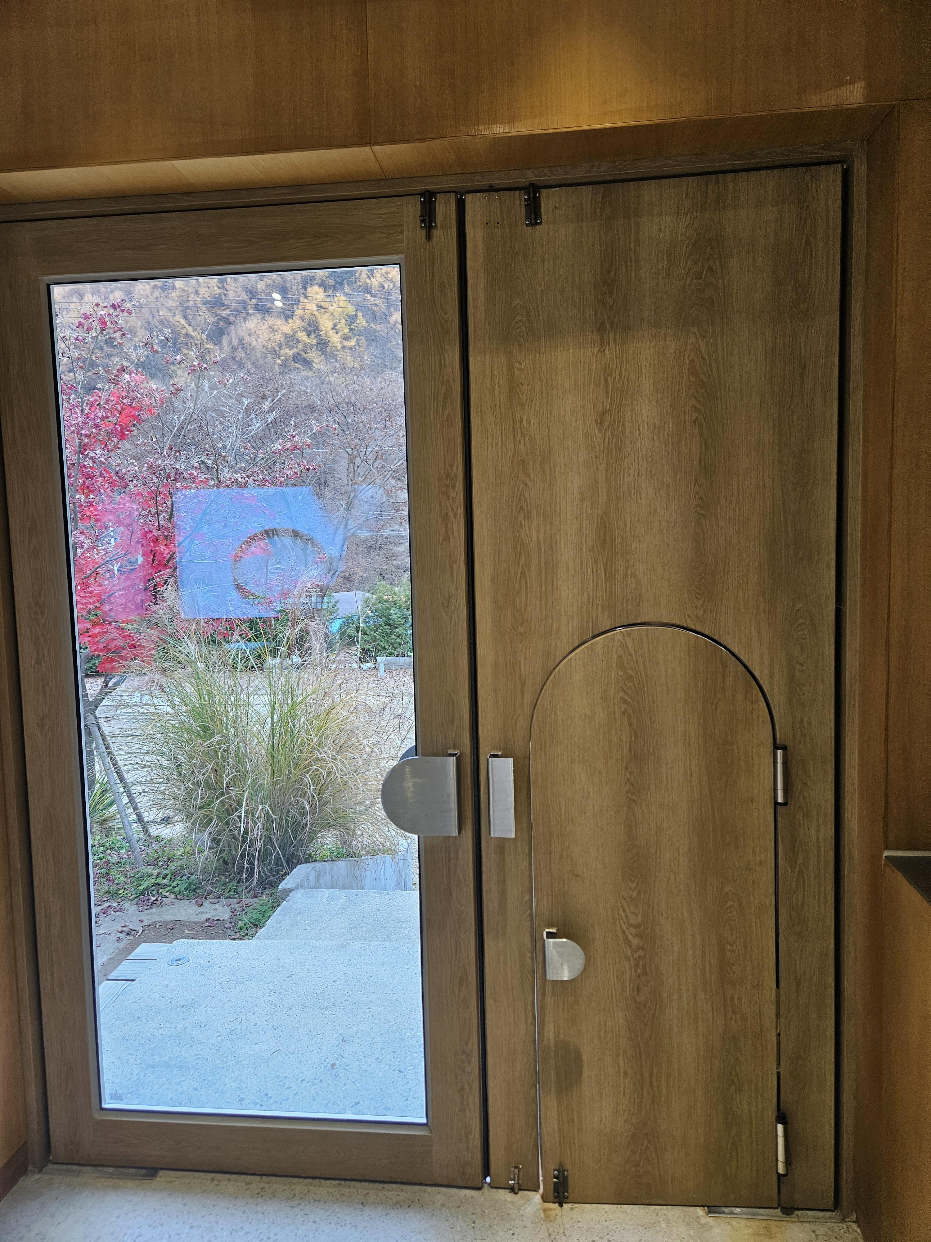 춘천 카페 오월학교의 입구 모습입니다. 내부에서 바라본 입구는 마치 어른 전용 입구와 어린아이 전용 입구가 분리되어 있는 듯한 인상을 주었습니다. 실제로 그 작은 문이 열리는 모습은 보지 못했지만, 만약 열린다면 색다른 분위기를 느낄 수 있을 것 같다는 생각이 들었습니다.