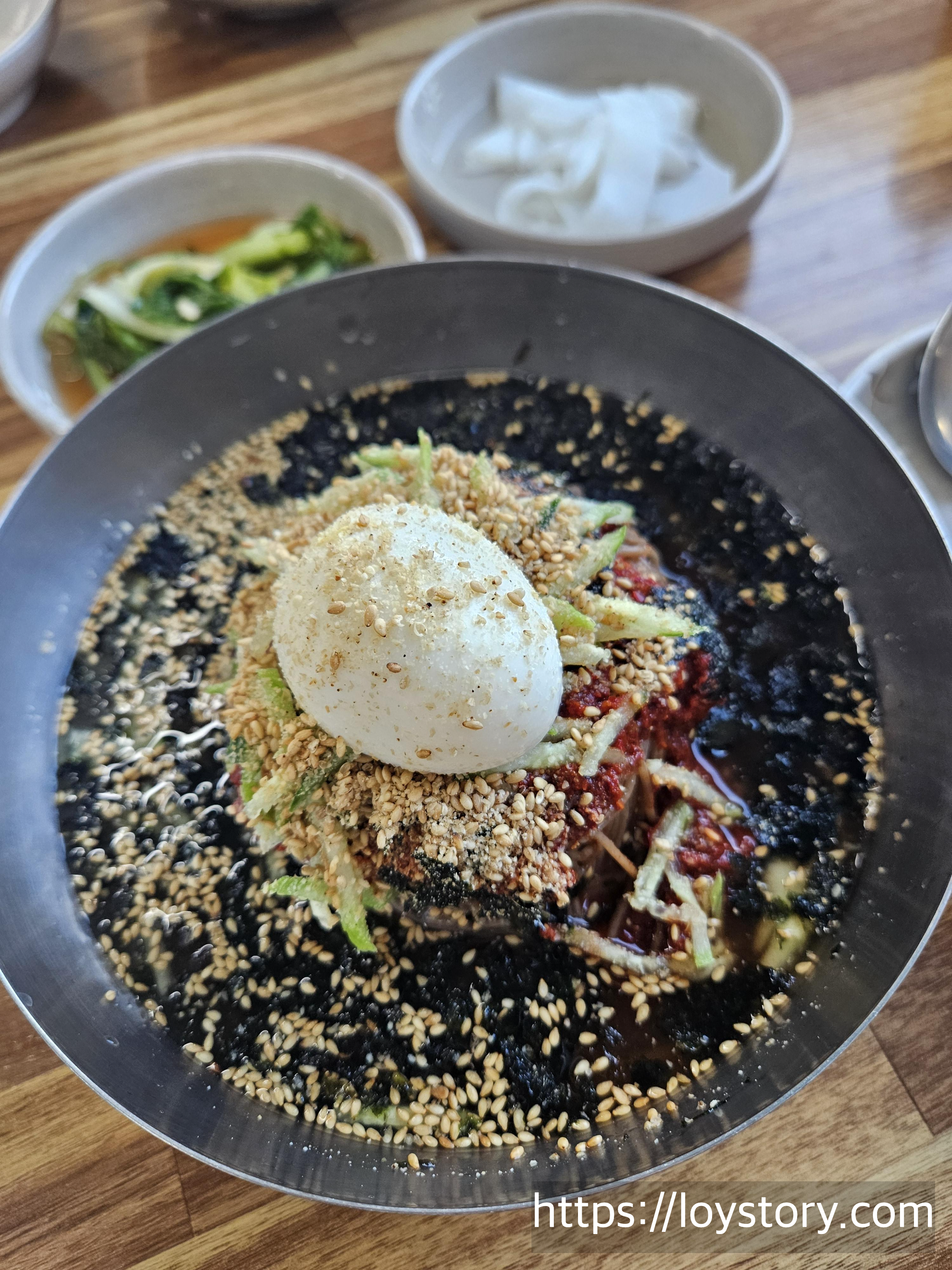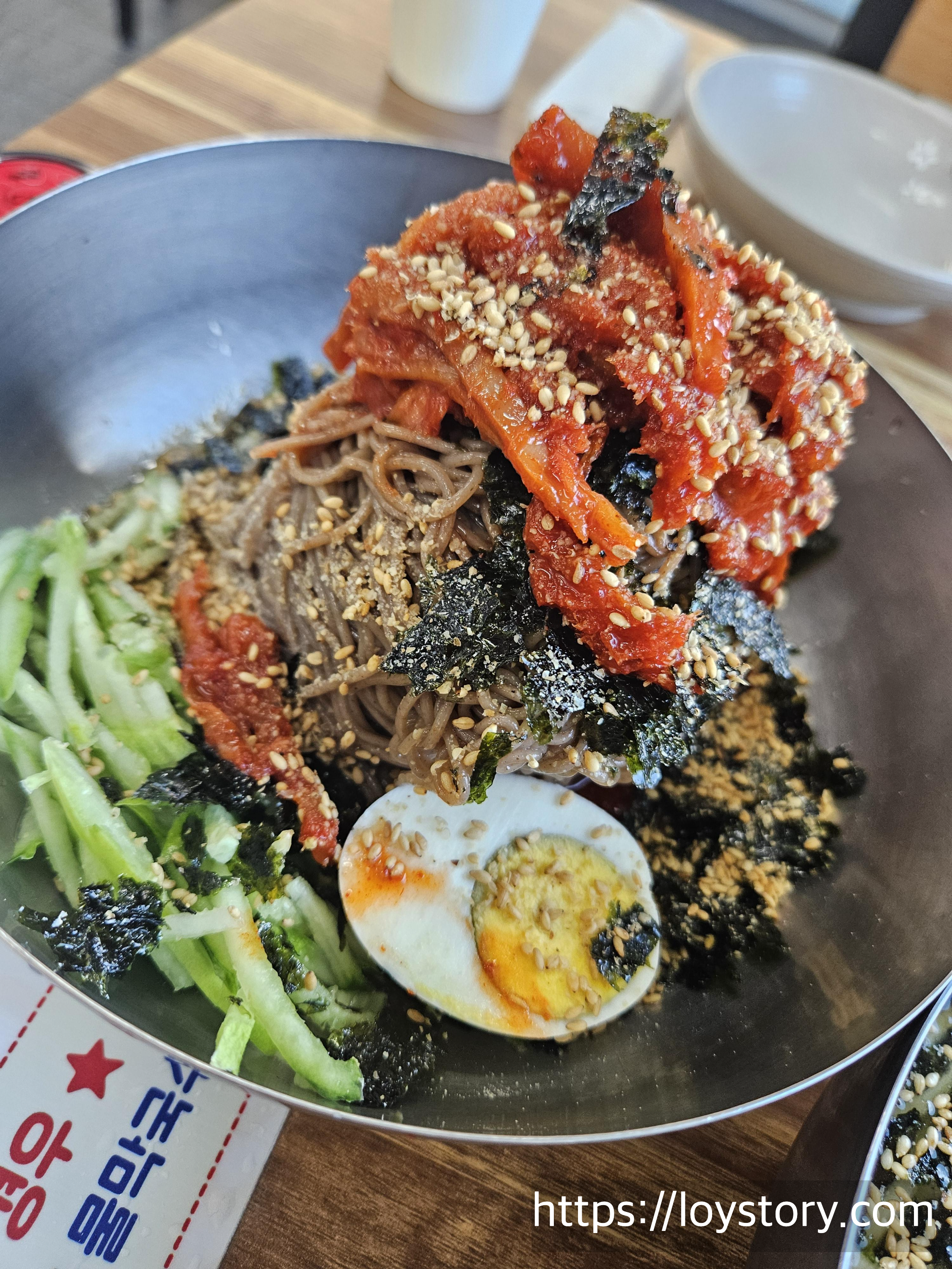 소돌막국수의 비빔막국수입니다. 고봉밥처럼 높이 쌓인 메밀 막국수 면 위에 올라간 명태식해가 가장 눈에 띕니다. 이 식해는 정말 특별했는데, 쫄깃한 식감과 매콤함, 그리고 특유의 감칠맛이 어우러져 비빔막국수의 맛을 완성시키는 핵심 요소였습니다. 명태식해 덕분에 막국수가 더욱더 풍부한 맛을 자랑하며 그 존재감을 제대로 드러냈습니다.