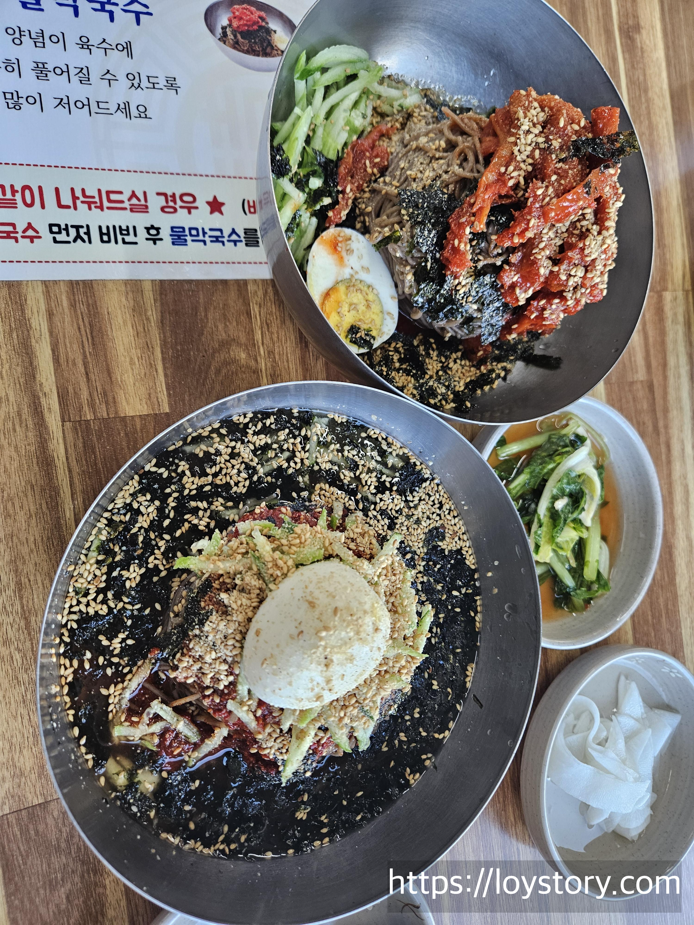 같이 나눠드실경우, 비빔막국수 먼저 비빈 후 물막국수를 드시고 비빔막국수를 드세요