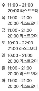 - 영업시간 : 정해진 휴무일 없음 / 그 외 영업시간은 아래 표 참조