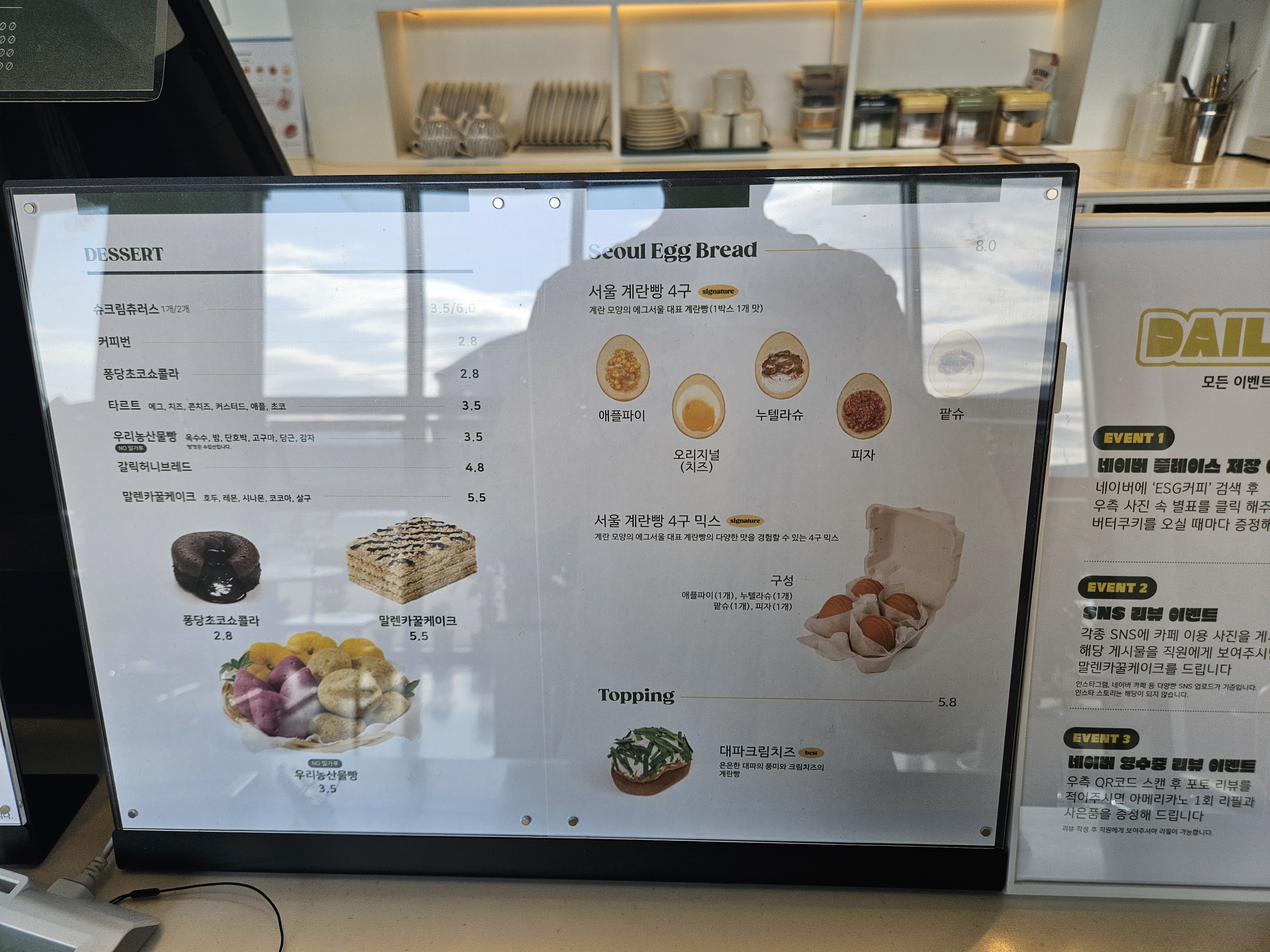 춘천 카페 ESG 커피에서 제공하는 다양한 디저트 중, 특히 에그서울(egg seoul) 계란빵 4종이 인상 깊었습니다. 에그서울은 제주 목장에서 생산되는 무항생제 계란을 사용한 계란빵의 업그레이드 버전으로, 그 신선하고 부드러운 맛이 특징입니다.