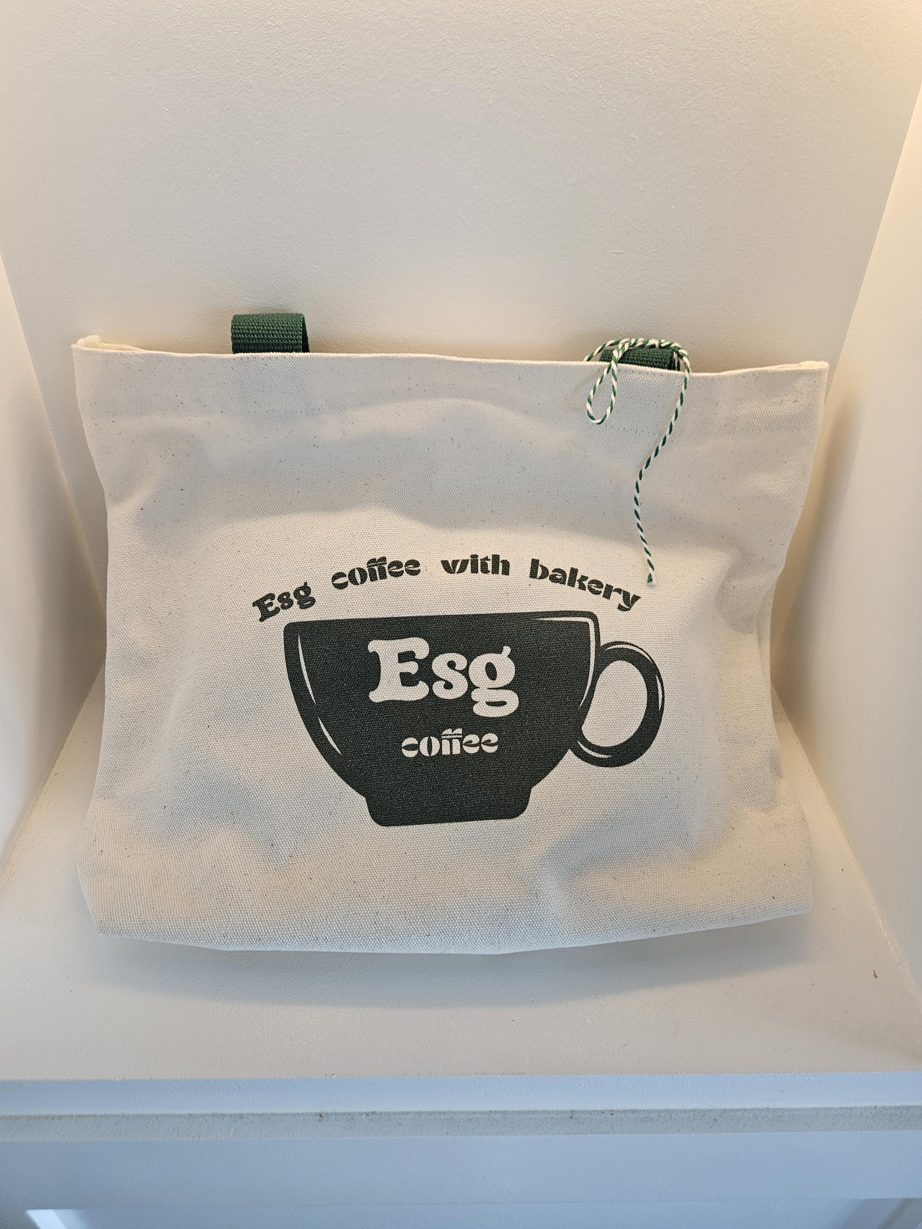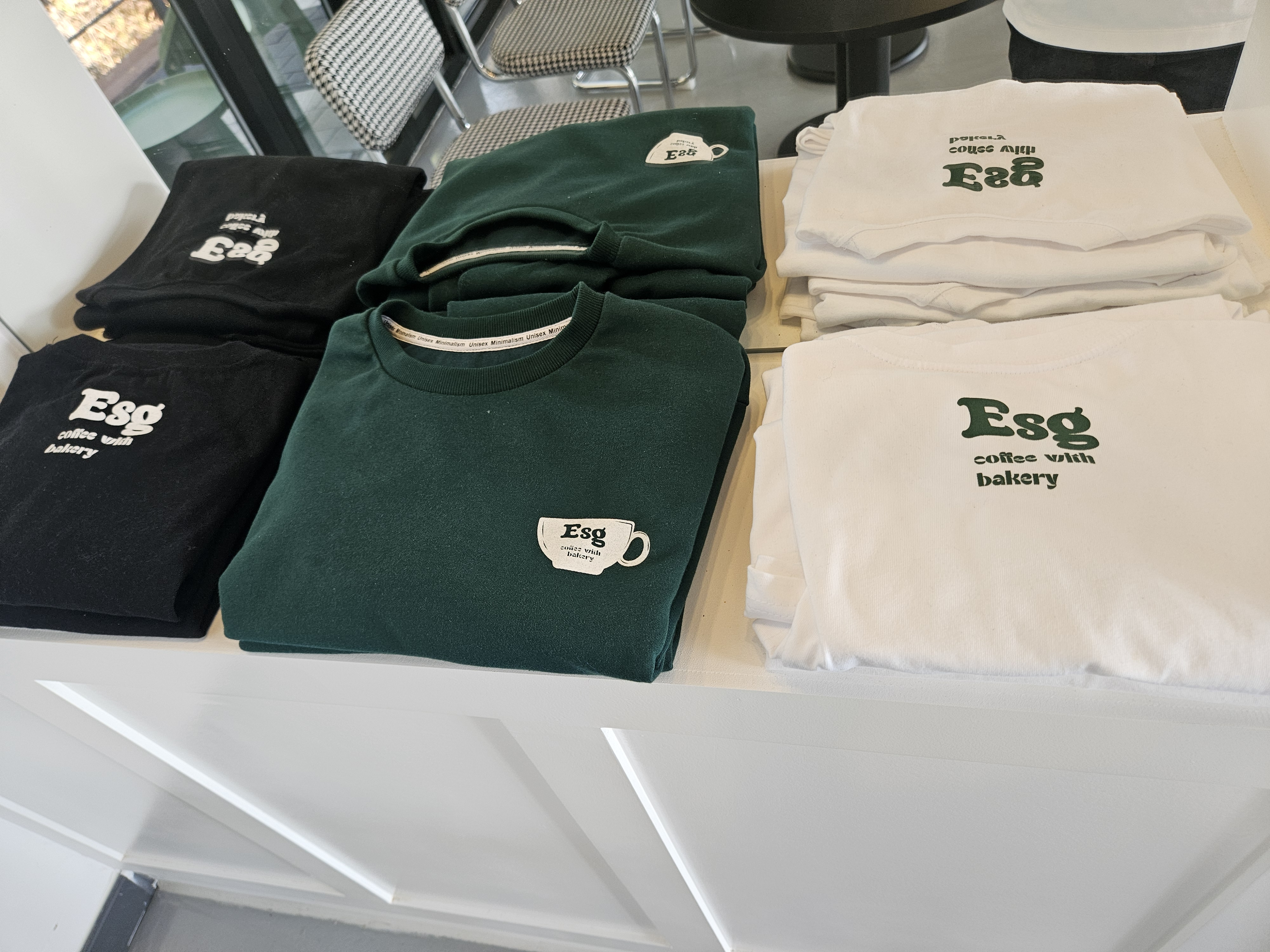 춘천 카페 ESG 커피에서는 다양한 굿즈들을 판매하고 있었습니다. 매장 한쪽에는 ESG 커피의 로고가 새겨진 옷, 모자, 에코백 등 여러 상품이 전시되어 있었습니다. 이곳의 굿즈들은 단순히 로고가 있는 아이템을 넘어, ESG의 가치를 담은 실용적이고 감각적인 디자인이 돋보였습니다. 환경을 생각하며 제작된 듯한 에코백은 특히 인기가 많을 것 같았는데요. 방문할 때마다 다른 굿즈가 추가되었는지 확인해 보는 재미도 있을 것 같네요!
