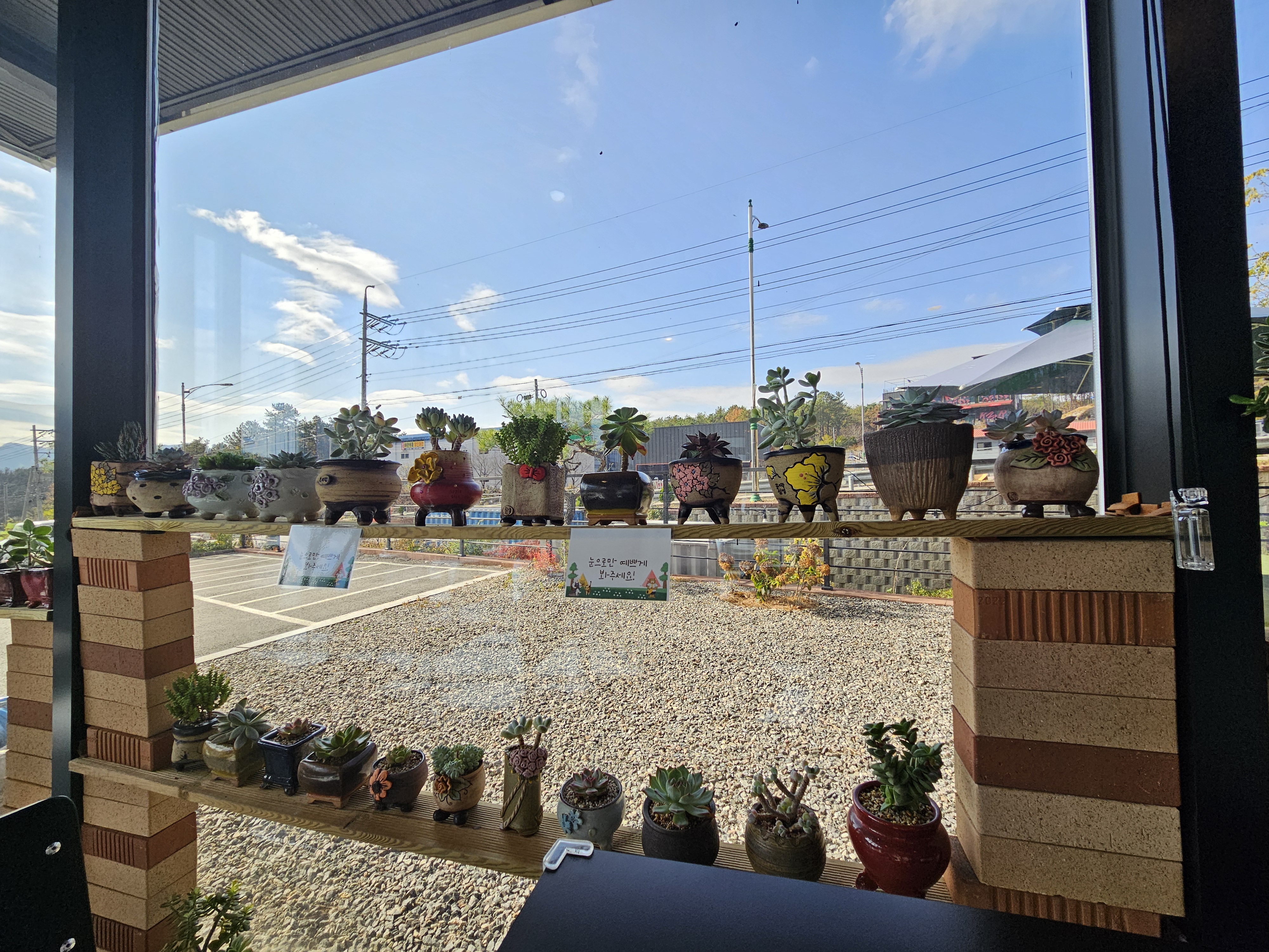 춘천 카페 ESG 커피의 창가에는 귀여운 화분들과 다양한 다육식물들이 아기자기하게 배치되어 있었습니다.