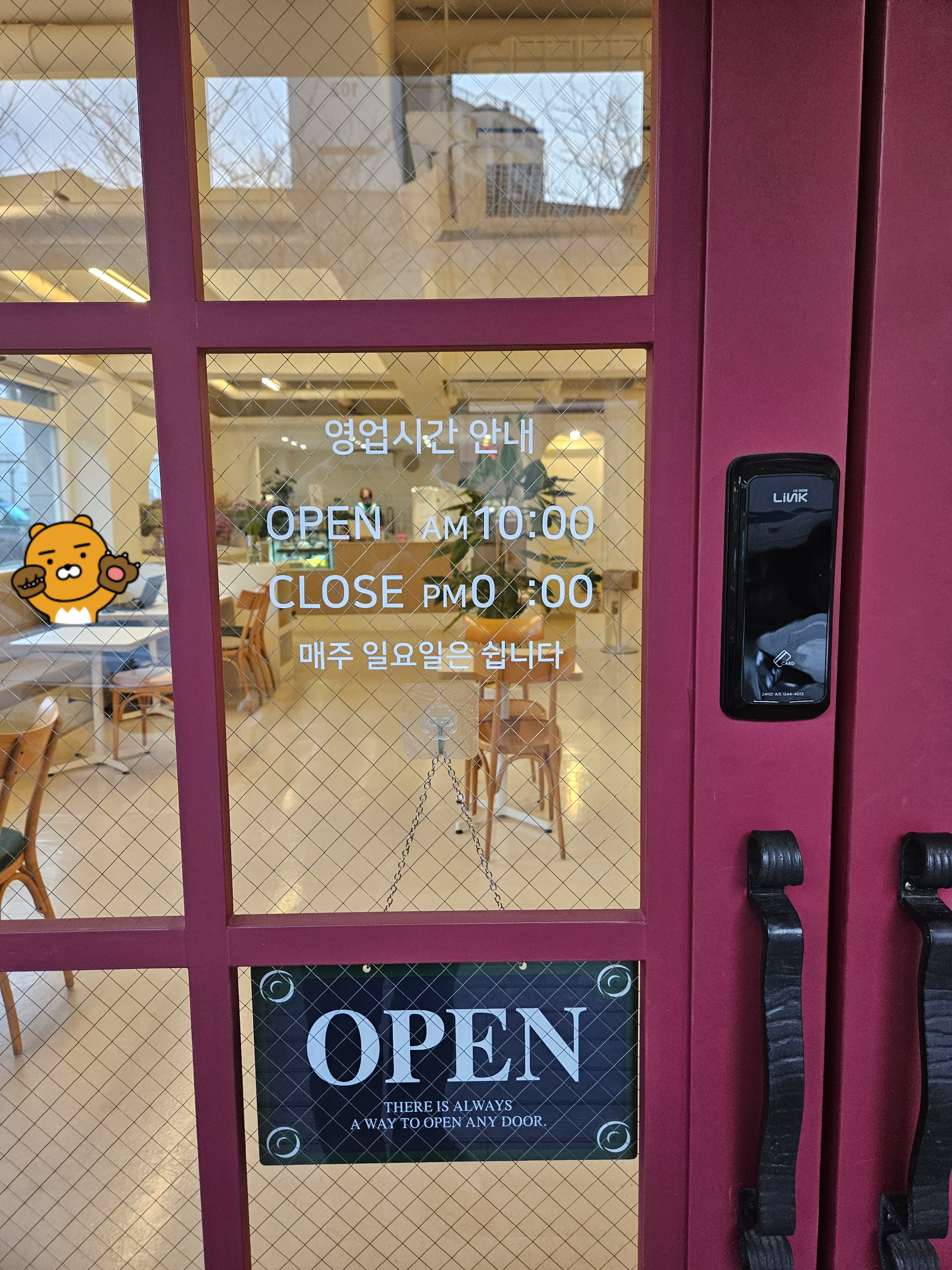 춘천 카페 라온의 입구 모습은 첫인상부터 따뜻하고 아늑한 분위기를 자아냅니다. 입구에는 영업시간과 휴무 정보를 깔끔하게 안내하고 있어 방문객들에게 친절한 첫인상을 제공합니다.