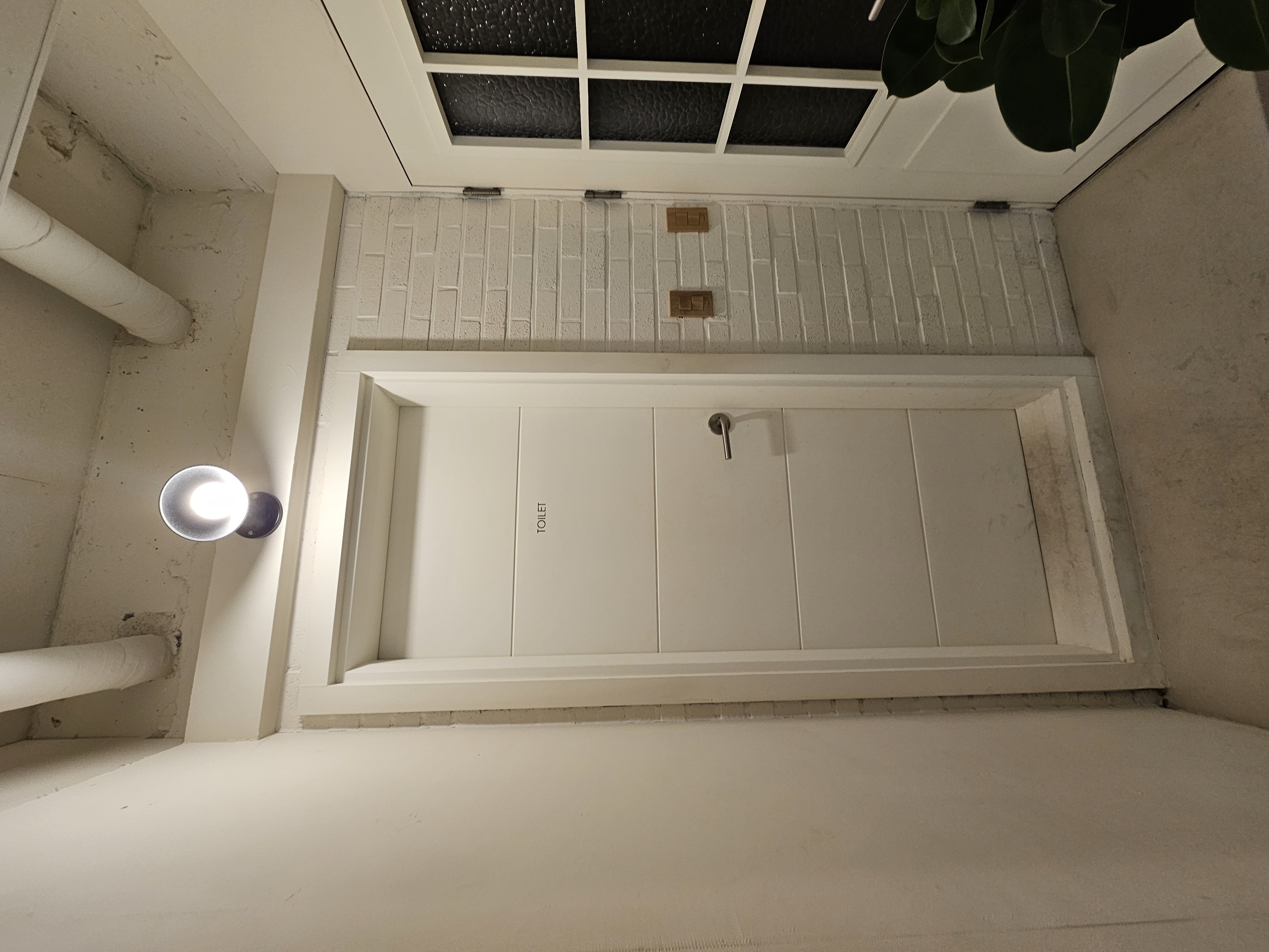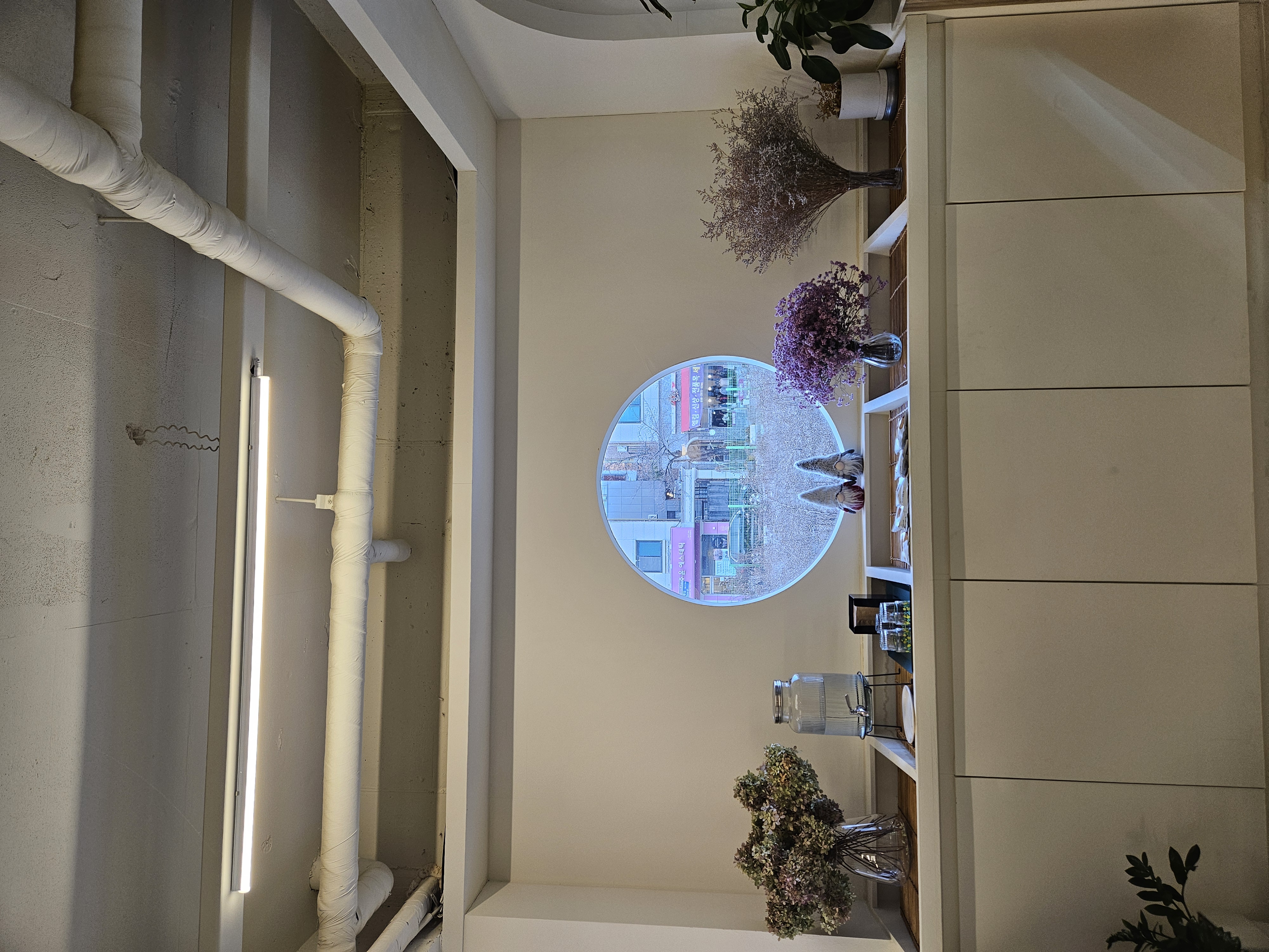 특히, 원형 창문을 통해 보이는 풍경은 세련되고 감각적으로 꾸며져 있어 눈길을 사로잡습니다. 또한, 화장실로 향하는 길목의 전신 거울 공간도 매우 인상적입니다.