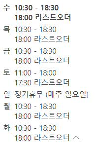 - 영업시간 : 매주 일요일 휴무 / 그 외 영업시간은 아래 표 참조