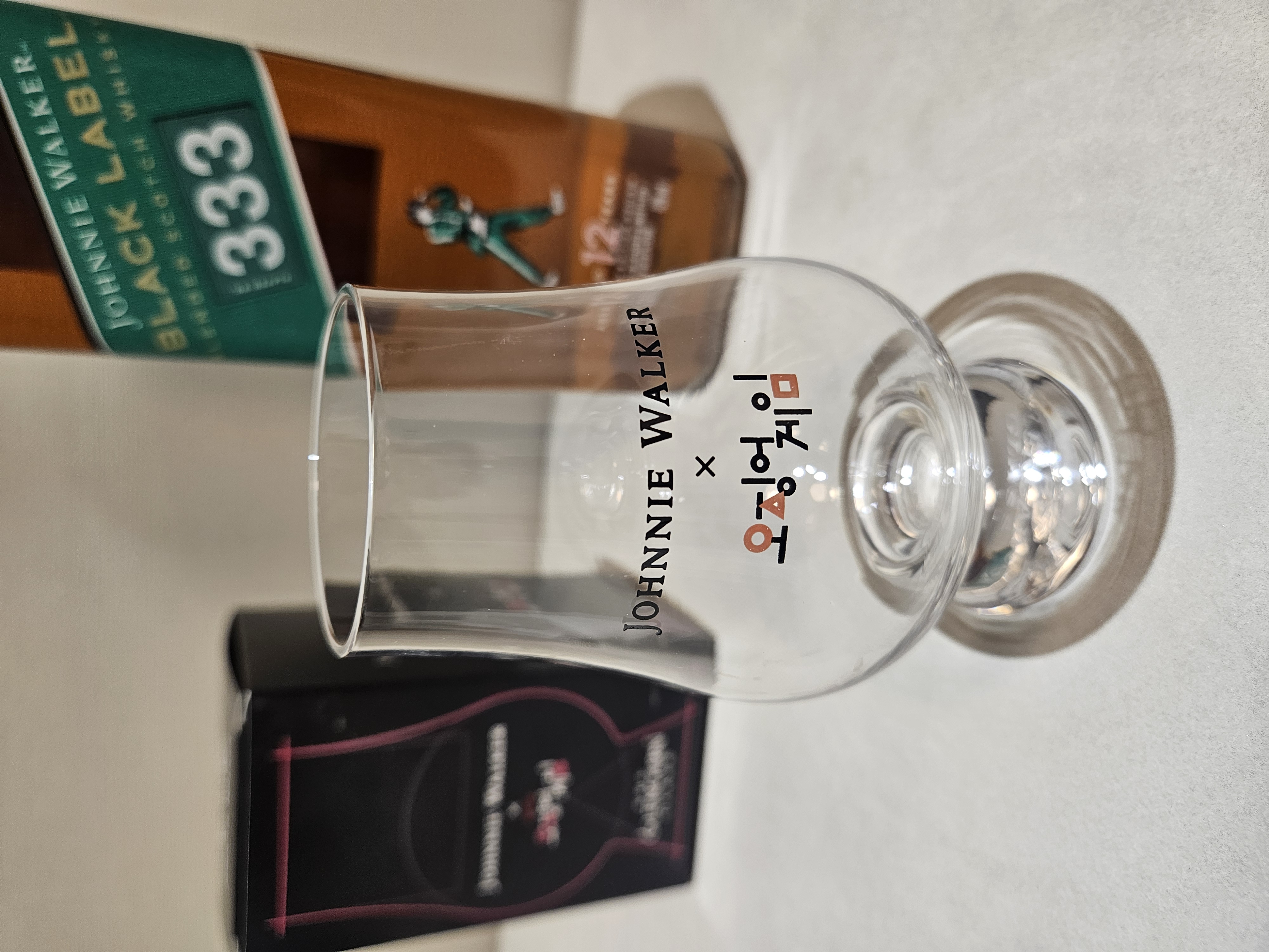 보이시나요? 영롱하게 빛나는 조니워커 블랙 오징어 게임 한정판 글랜캐런 잔의 모습이! 제가 기존에 가지고 있던 글랜캐런 잔은 투명 유리잔에 검은색 글씨만 새겨져 있던 천편일률적인 디자인이었지만, 이번에 선물로 받은 잔은 오징어 게임 특유의 강렬한 색상 조합, 즉 빨간색과 검은색의 조화가 돋보이는 디자인으로 한정판만의 독창적인 매력을 고스란히 담아냈습니다.